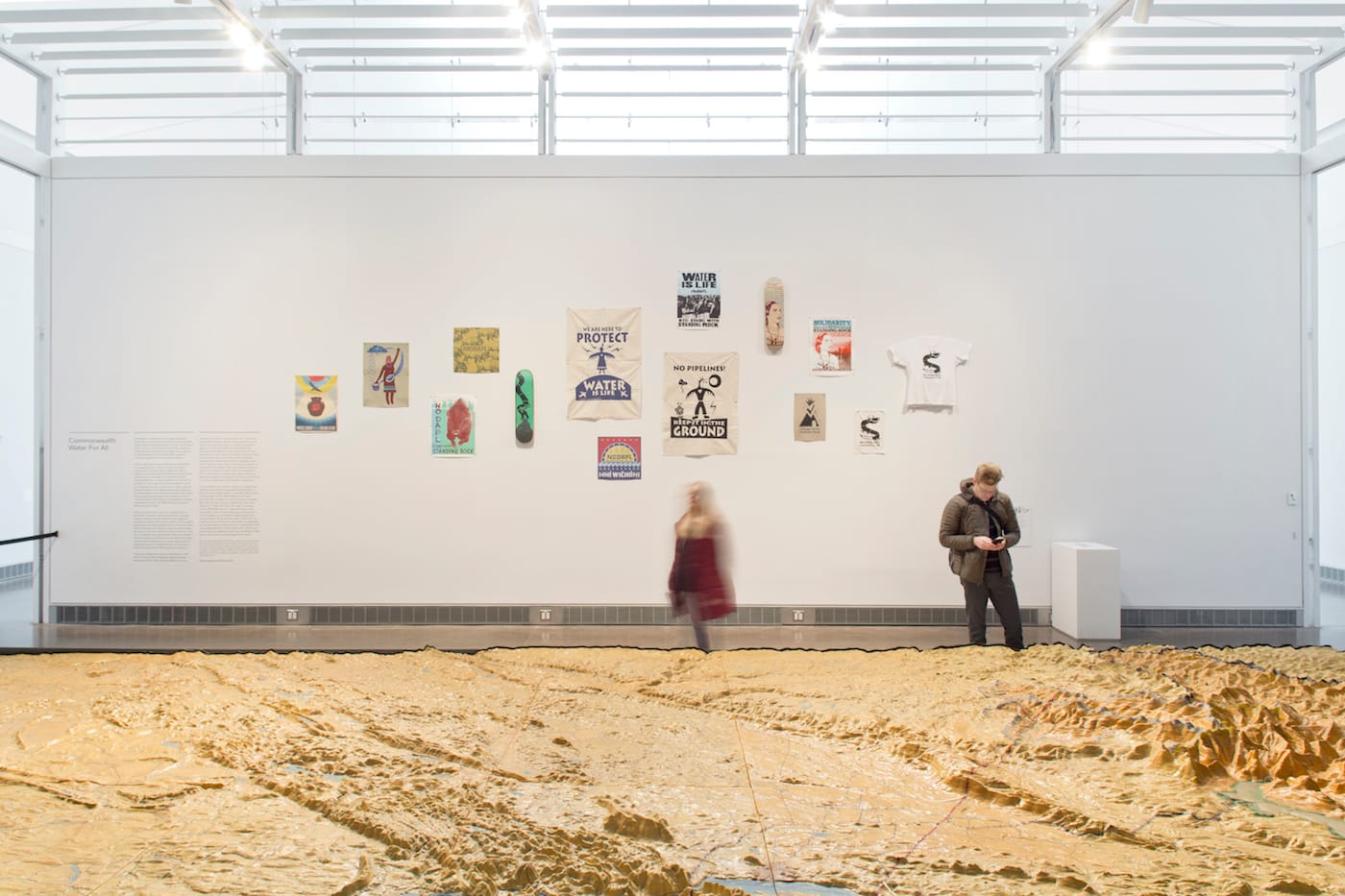 A gathering of recent agitprop about water, the Queens Museum’s Commonwealth: Water for All spotlights water’s political dimensions more directly than DNA of Water. For the exhibit, “the third in a series of contemporary exhibitions mounted in dialog with the [museum’s 1939 World’s Fair] Relief Map of New York City’s Water System,” several series of artists’ prints, as well as sundry political t-shirts and skateboards, hang on the walls around the WPA-commissioned map. This exhibition and the larger series are smartly curated by the museum — tucked away in a back room, the bleached brown topographic map of New York’s aqueducts has always felt uninspired in comparison to its show-stopping 1964 World’s Fair cousin, “Panorama of the City of New York.” Like wall hangings in a teenager’s bedroom, the exhibition’s colorful posters make the relief map room feel more lived-in and personable.