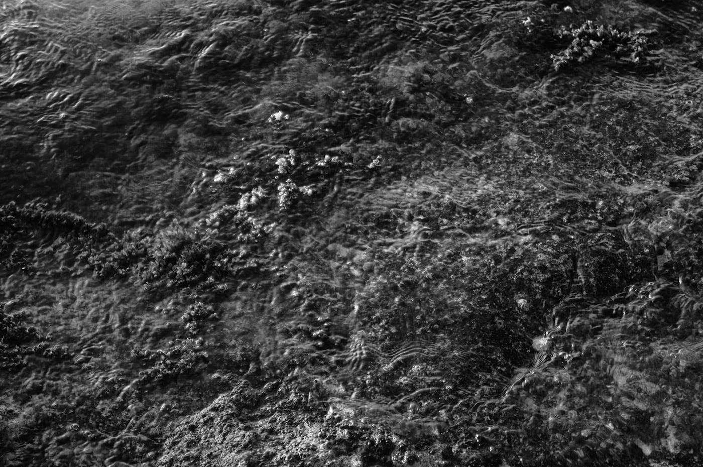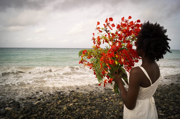 Deborah Jack’s photographic and filmic depictions of shorelines, on display in DNA of Water, encapsulate the tension between water’s tranquility and its tumult. On the surface, her 2016 short film and eponymous photograph series, The Water Between Us Remembers, seem to be hypnotic, minimalist meditations on water’s formal properties. But her sharp, studied compositions — shot in St. Martin, where she was born — contain hints of menace amid their beauty. Backlit, subtly darkened, and never containing more than a solitary person, the black and white photographs churn with a sense of dramatic discord. And the film, whose exasperated full title is The Water Between Us Remembers, so we carry this history on our skin… long for a sea-bath and hope the salt will heal what ails us, emits, as its soundtrack, a low pulsing drone that looms over the screen’s idyllic environs like a portentous shadow.