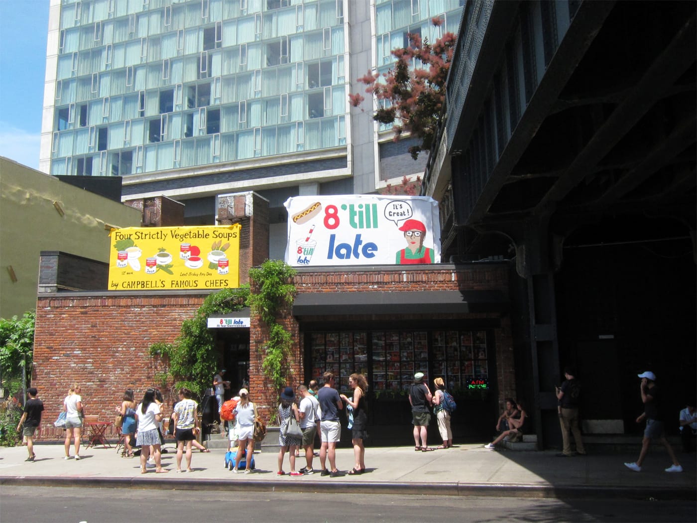 Notably, IRL access to Sparrow’s works, which are also available for sale online, was created by the Standard Hotel, which invited her to set up shop in its event space known as the Garden Room. The installation’s privileged location underscored its narrative of the threatened independent shop: 8 ’till late stood next to the Standard’s Biergarten, surrounded by trendy brunch spots and designer stores; the only obvious reminder of the area’s gritty past, Hector’s Cafe & Diner, an oasis of egg creams and griddle specials, stands across the street. But Sparrow’s nostalgic nod to real estate and gentrification becomes a little half-hearted when you consider that the bodega’s sponsor was a boutique hotel chain that has hugely transformed the neighborhood.