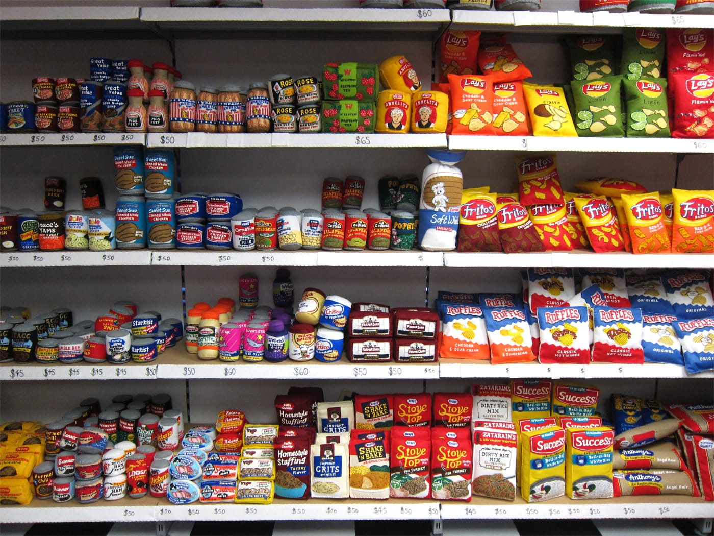 Sparrow, of course, is far from the first artist to create a convenience store, although she may be the first to realize one solely out of her textile of choice. Claes Oldenburg famously opened a storefront on the Lower East Side in 1961, filled with sculpted versions of everyday merchandise, all for sale. Since 2007, artist Xu Zhen has shown iterations of his “ShanghART Supermarket” in Miami, Shanghai, and Singapore; the full-scale replica of a typical Chinese convenience store hawks real products completely devoid of their contents, and they’ve proved a big hit at each venue. And earlier this year, Gabriel Orozco created “OROXXO” in Mexico City, a replica of a Mexican convenience store that he stocked with items branded with his artist’s mark.