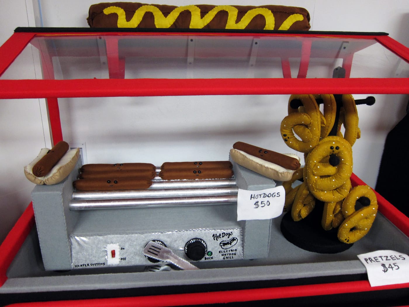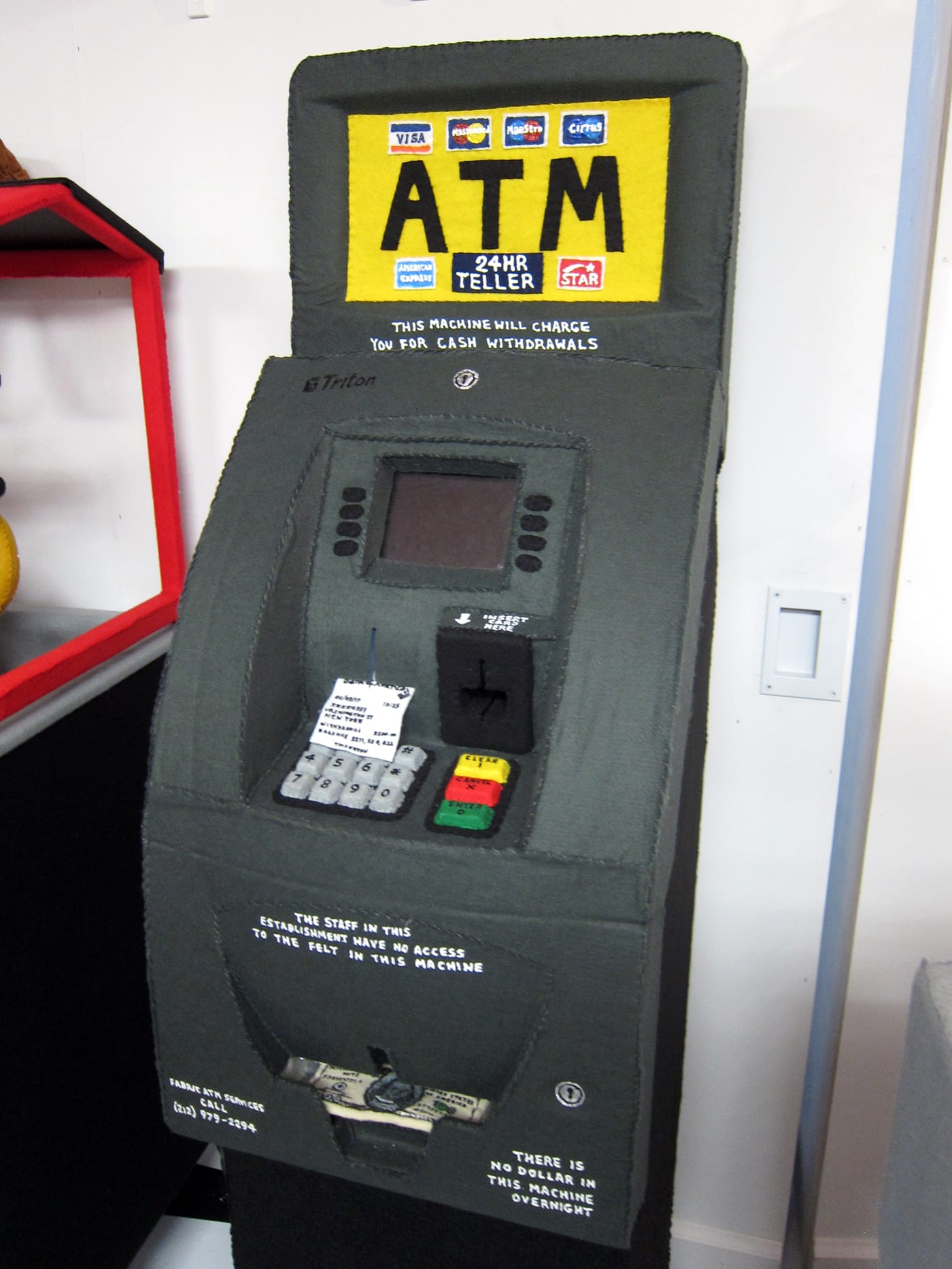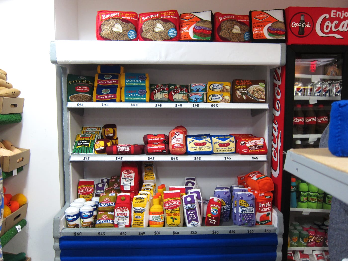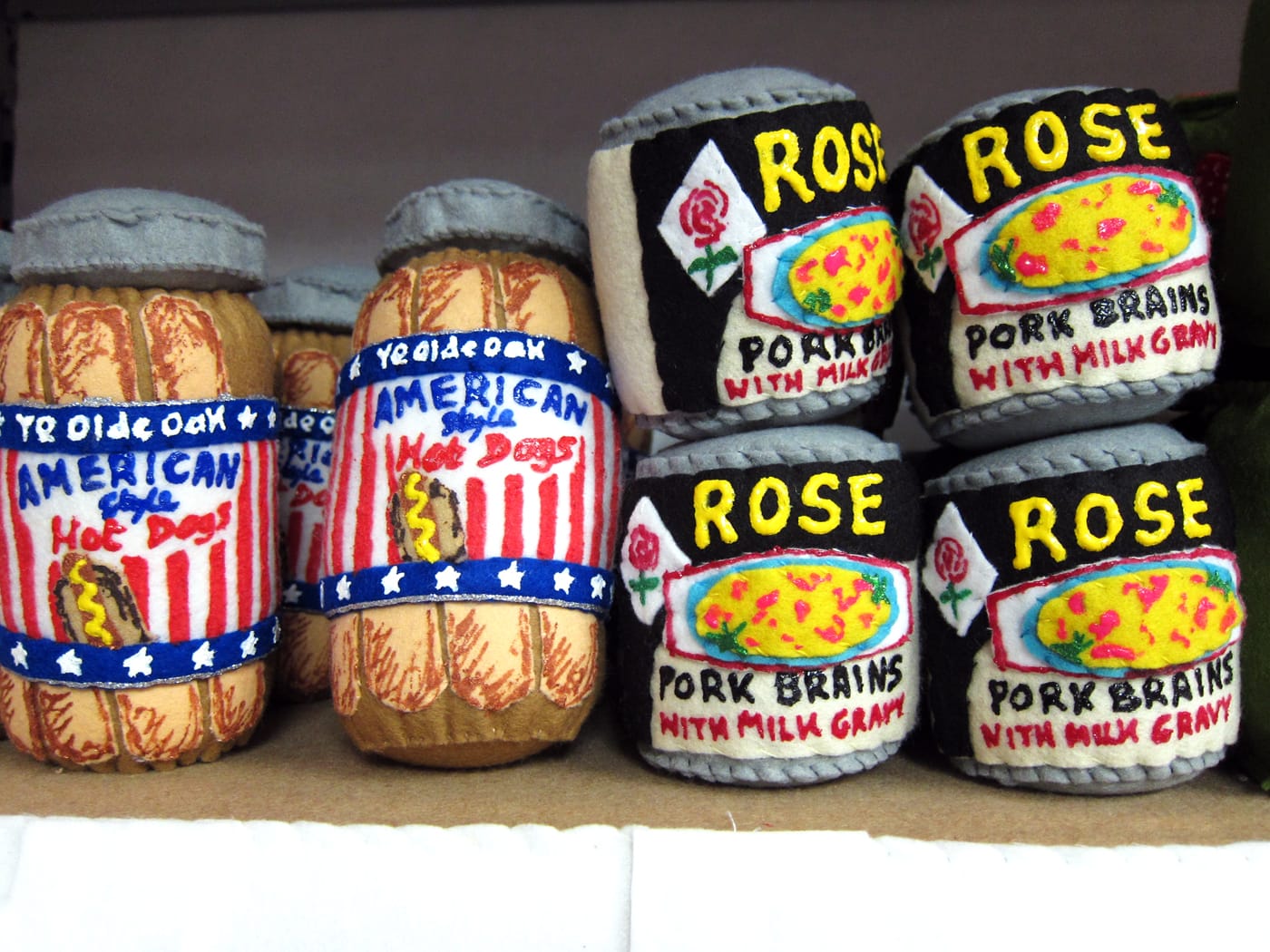 And what wasn’t to love, or at least fawn over? Inside the 1,200-square-foot space, alongside shelves lined with felt versions of canned vegetables, chip bags, candy, and personal hygiene supplies, were all the amenities of a typical bodega, impeccably realized: an ATM, an ice-cream freezer, a soda-packed fridge, and a cigarette shelf behind the counter. Other, more upscale additions included a hot dog stand (largely a 7-Eleven staple, to nitpick), a meat counter with fancy, weirdly anthropomorphized sausages (on which perched the necessary black bodega cat), and, oddest of all, a shelf with paperbacks, records, and even cassette tapes (was this a bodega for hipsters?). Almost every other object was a more familiar sight, although, I have to say, I’ve never spotted canned pork brains with milk gravy in my neighborhood bodega.
