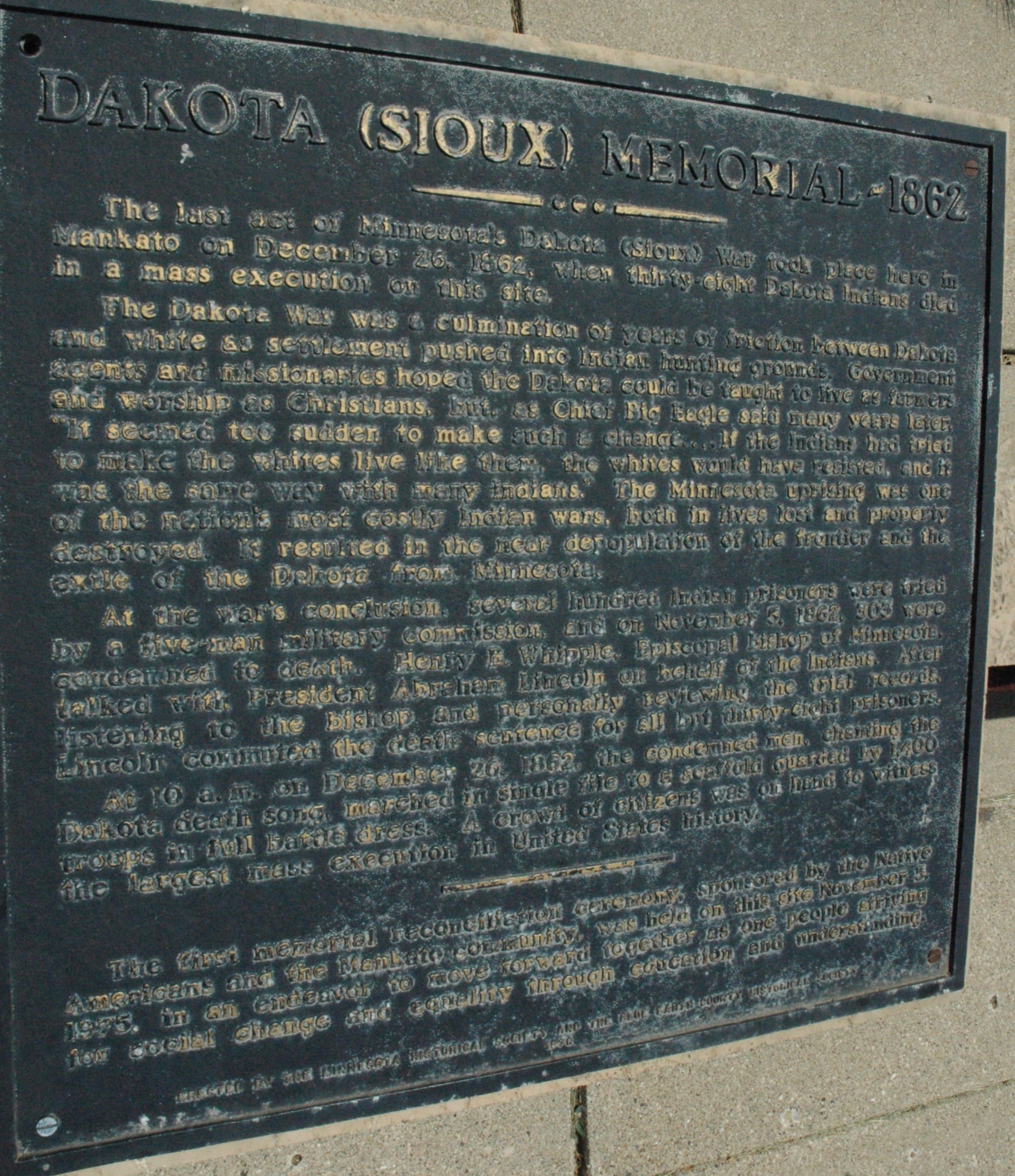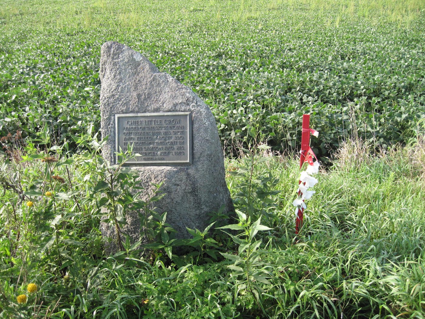 One historical marker, erected in 1929 at the spot where Chief Little Crow (who escaped the hanging) was shot, glorifies the chief’s killer: “Chief Little Crow, leader of the Sioux Indian outbreak in 1862, was shot and killed about 330 feet from this point by Nathan Lamson and his son Chauncey July 3, 1863.” The marker does not mention that Little Crow’s body was mutilated, that his scalp was donated to the Minnesota Historical Society and put on display at the State Capitol. He would not be buried until 1971.