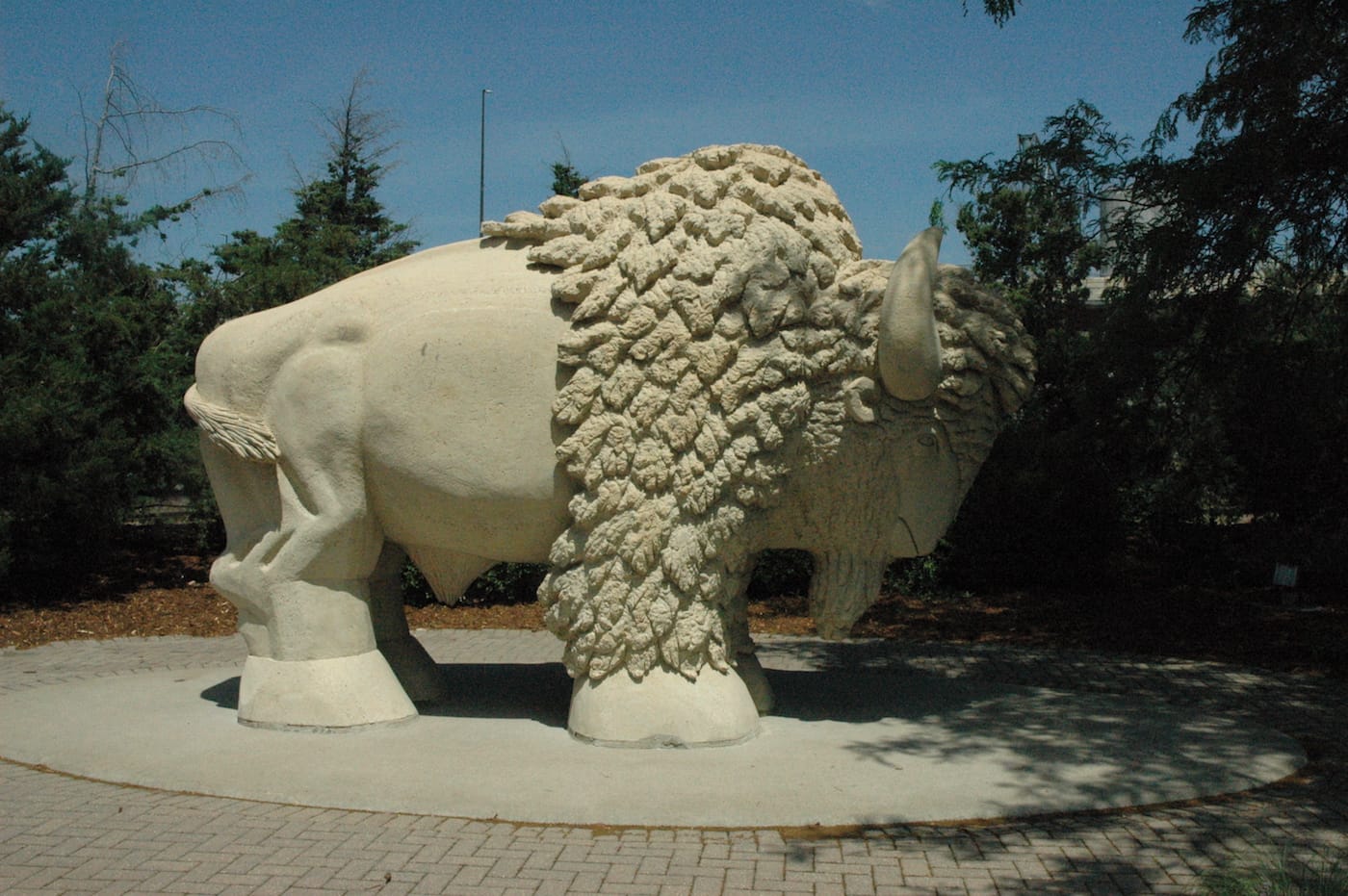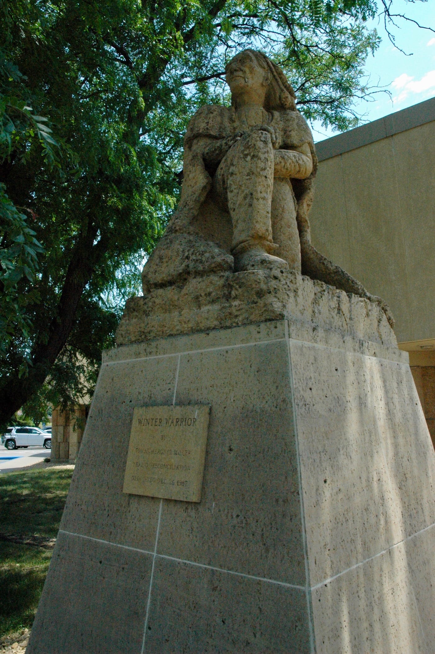 Another memorial sits at the actual hanging site in Mankato, containing memorial objects that have amassed over the years. First, in 1987, the Minnesota Historical Society and the Blue Earth County Historical Society, in collaboration with Dakota leaders, erected the statue “Winter Warrior” by Mankato-based artist Thomas Miller, featuring a Dakota warrior figure, to coincide with the “Year of Reconciliation” proclaimed by Governor Rudy Perpich. Ten years later, Reconciliation Park was established across the street, along with a second statute by Miller of a buffalo. Then, in 2012, for the sesquicentennial of the war, another monument was added to the park, evoking a scroll with a list of all the names of the men who were killed.