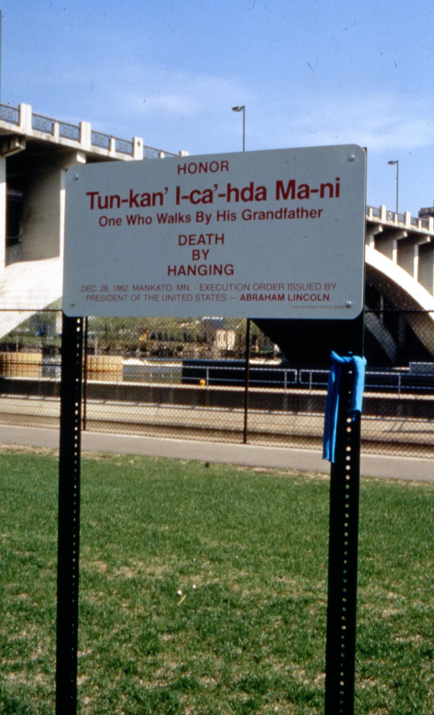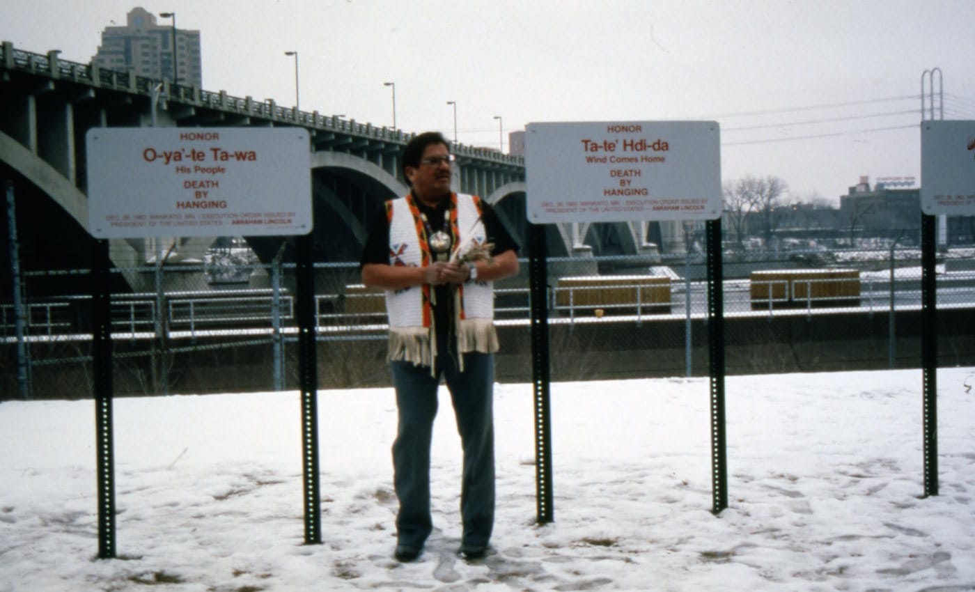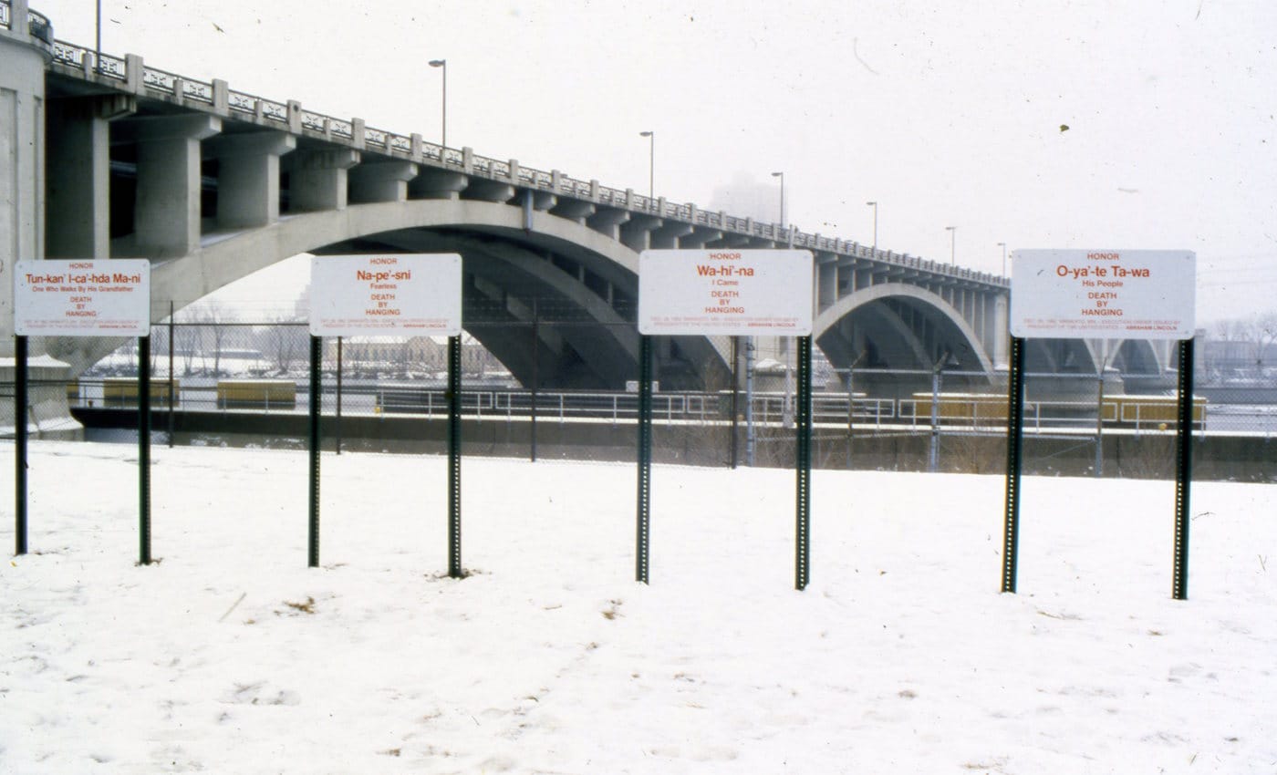 MINNEAPOLIS — In 1990, Cheyenne and Arapaho artist Hock E Aye Vi Edgar Heap of Birds installed a public installation along the Mississippi River on the east side of Downtown Minneapolis called “Building Minnesota,” which recognized the Dakota men who were hung by the United States Government at the end of the US–Dakota War of 1862. Each of the white, metal signs contained one of the names of the men hung in the largest mass execution in the country’s history, known as the Dakota 38 + 2, including the two additional warriors who were hung later under the order of Andrew Johnson. The signs also each contain the phrase “Death by Hanging,” and the name of Abraham Lincoln, who signed the order for the execution, as well as two with Andrew Johnson’s name.