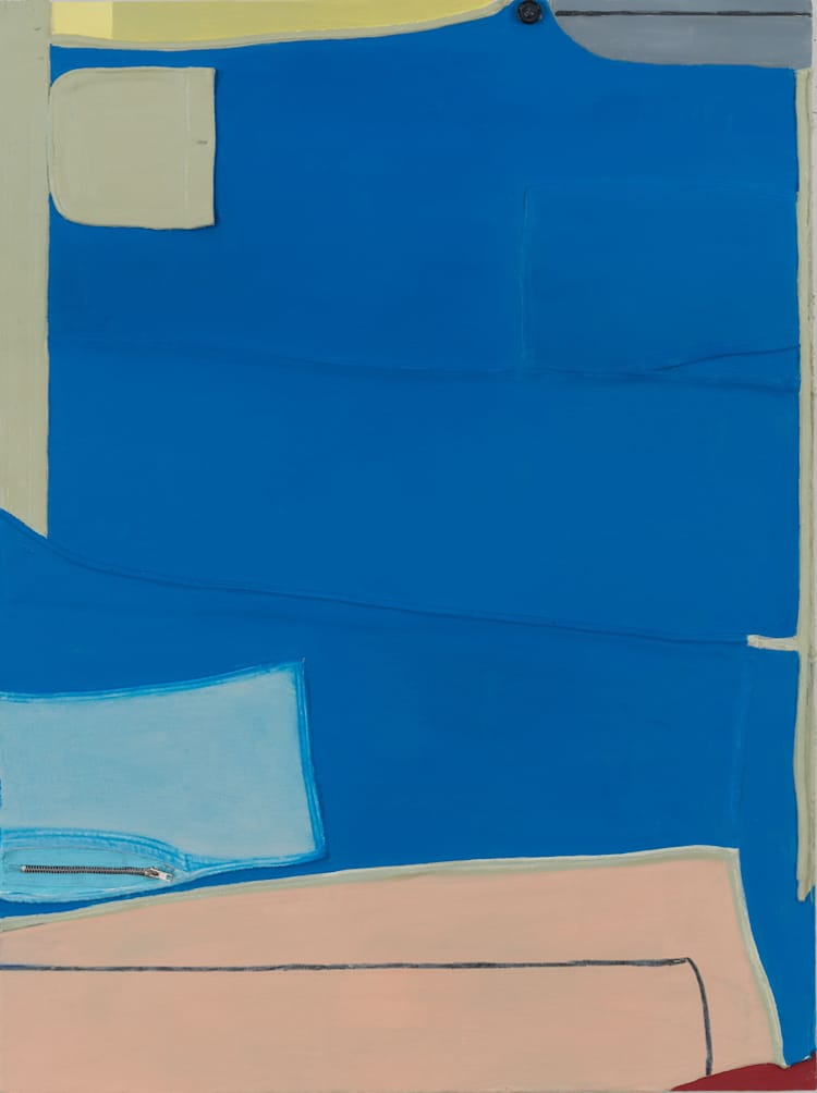 As my gallery-going companion said to me, seeing this show was like unexpectedly bumping into some old friends… even though we couldn’t quite remember where we’d first met. “A Dream of Peace” (60 by 78 inches, oil and mixed media on canvas; all paintings 2017 unless noted) typifies the collage-like method and appearance of the new work, in which broad areas of a single hue, outlined in (mostly) white piping are punctuated here and there by patch pockets, wide belt loops, big buttons, and puffy seams — indicators of sweat paints, pajamas and the like. These are pieced together in a way that synthesizes formal improvisation with the industrial imperatives of loungewear production. Featuring lemon yellow, two blues, warm earth pigments, and a pewter gray, the palette is designed for comfort.