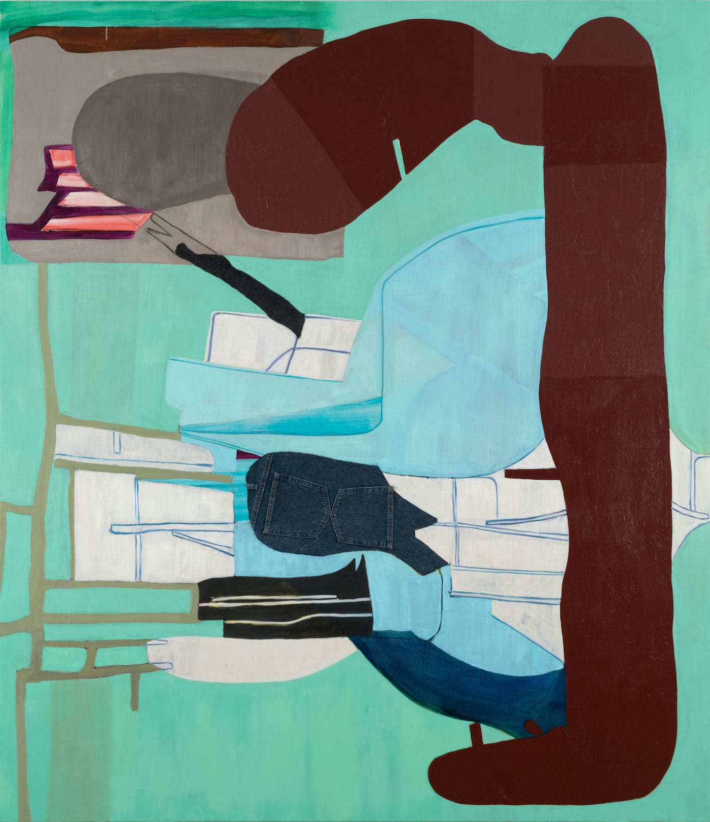 As in those drawings, which are indexical in scale to the human torso (by way of de Kooning’s shirt size), the general scale of the Scavenge paintings is guided by their constituent body-part-sized elements. Arms, inseams, waists, necks, etc., come in a relatively limited range of lengths, and the particular polyrhythmic pulse that animates these paintings needs just so much lateral movement, and no more. (Or less: “Left Unsaid,” at 40 by 30 inches, doesn’t really have enough elbow room to find a groove.)
