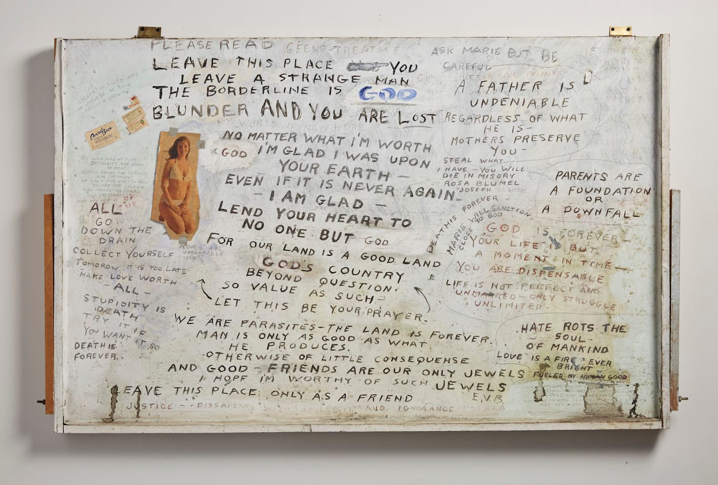 In one of Von Bruenchenhein’s handwritten texts, he stated, with self-awareness, “The real artist, one who comes from nothing, like I did, with no art schooling necessary, has to live in two worlds. I have to remain on my side of life, while the great majority live on their side. When they ask, how did you come by all the things you paint and form in clay, and since there is no answer for such things, I just have to live in my own little world.”