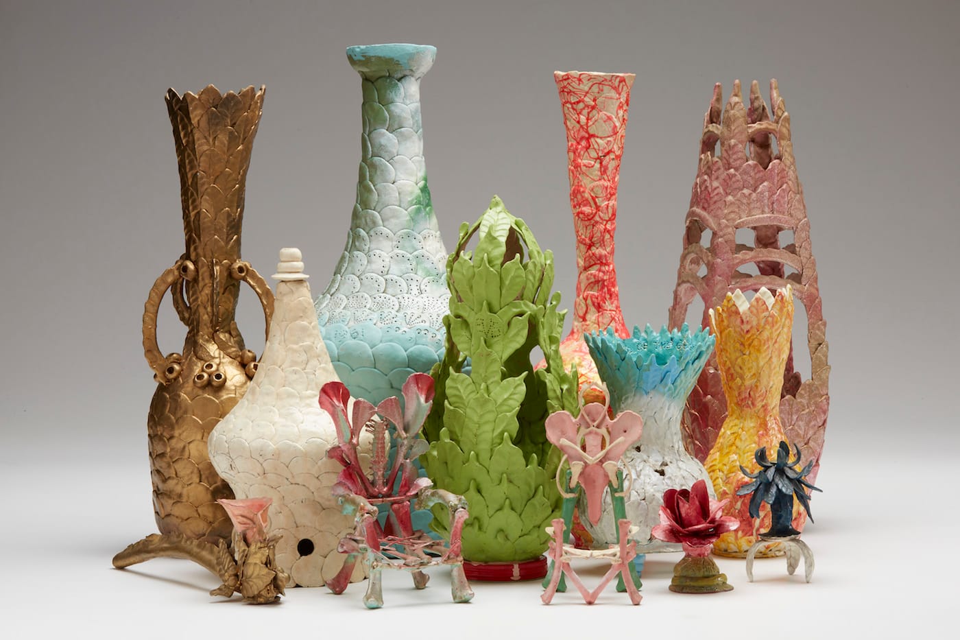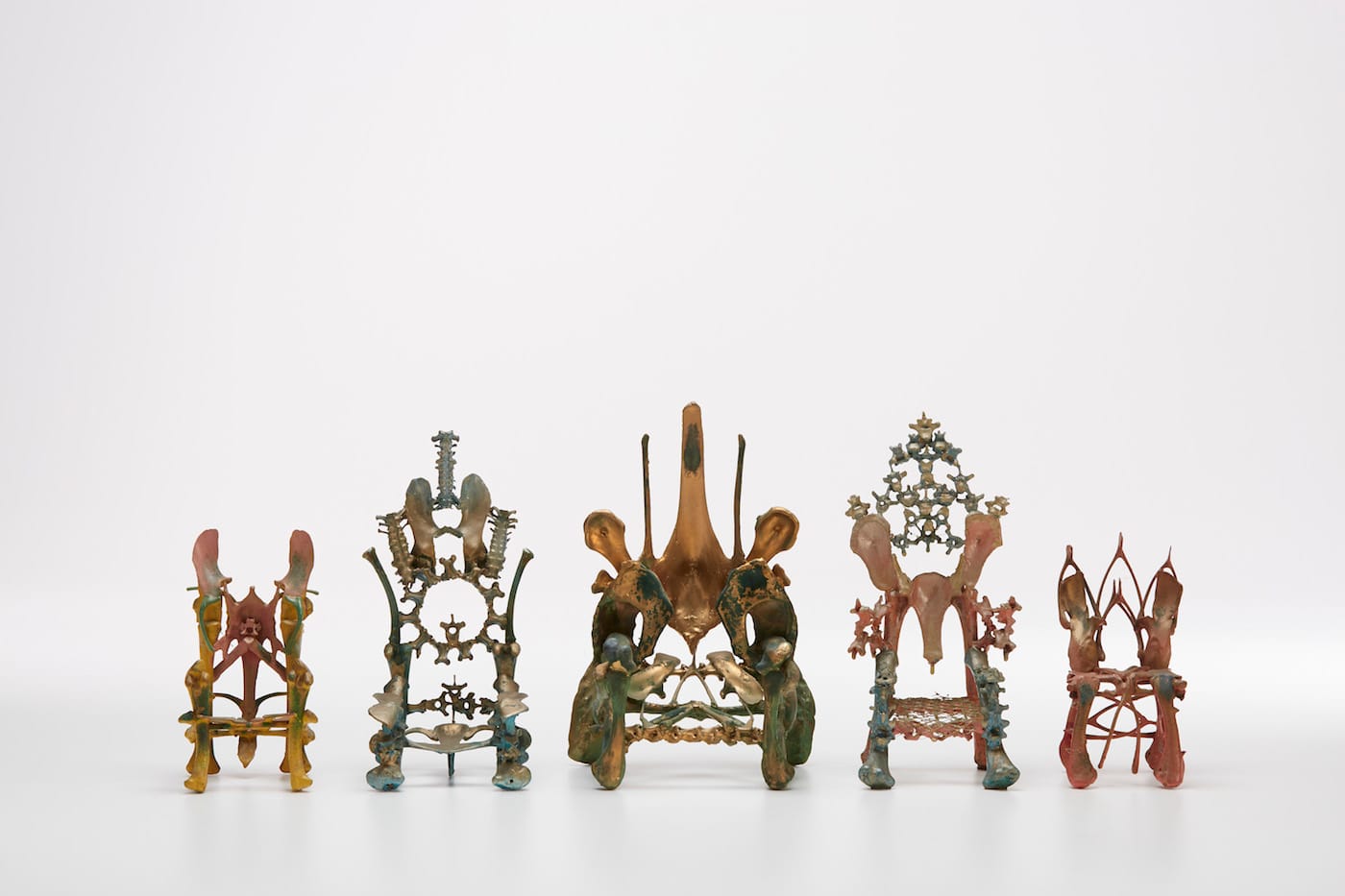 Von Bruenchenhein crafted painted-metal crowns for Marie to wear during their photo sessions as well as other, delicate ceramic crowns and vessels fashioned from small, leaf-shaped elements (resembling, in structure, the layered-leaf forms of artichokes). In the 1960s, he used chicken bones to make small throne sculptures, which he painted, and, later, tall, slender towers.