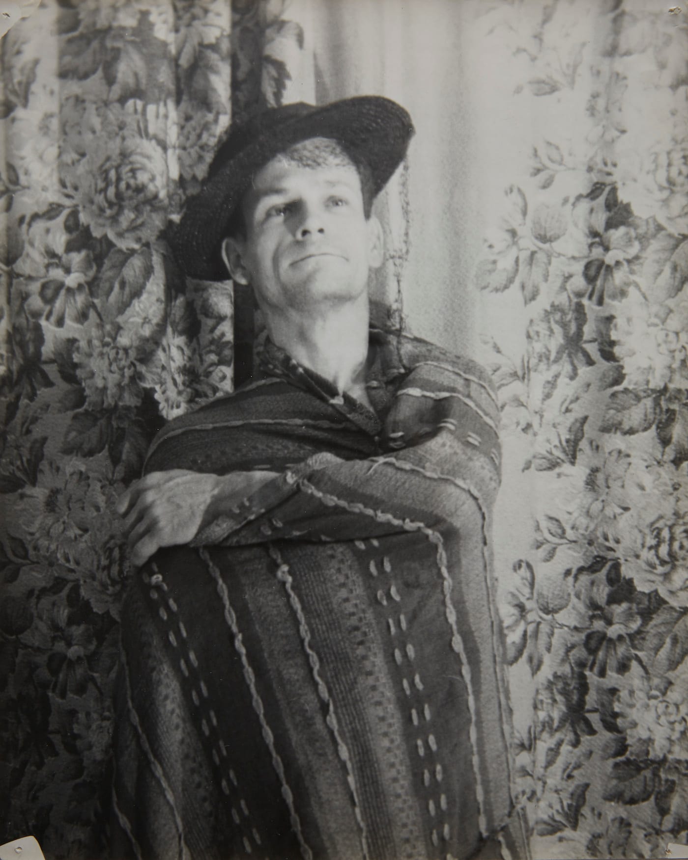 At some point he began posing Marie in jewels and costumes, semi-nude or stripped down to her panties, often set against patterned-fabric backdrops, to shoot his own black-and-white girlie pix. He processed his film in a darkroom in the couple’s bathroom; sometimes Marie hand-tinted the prints that showed her looking past the camera or sometimes staring directly but absently into its inquisitive lens.