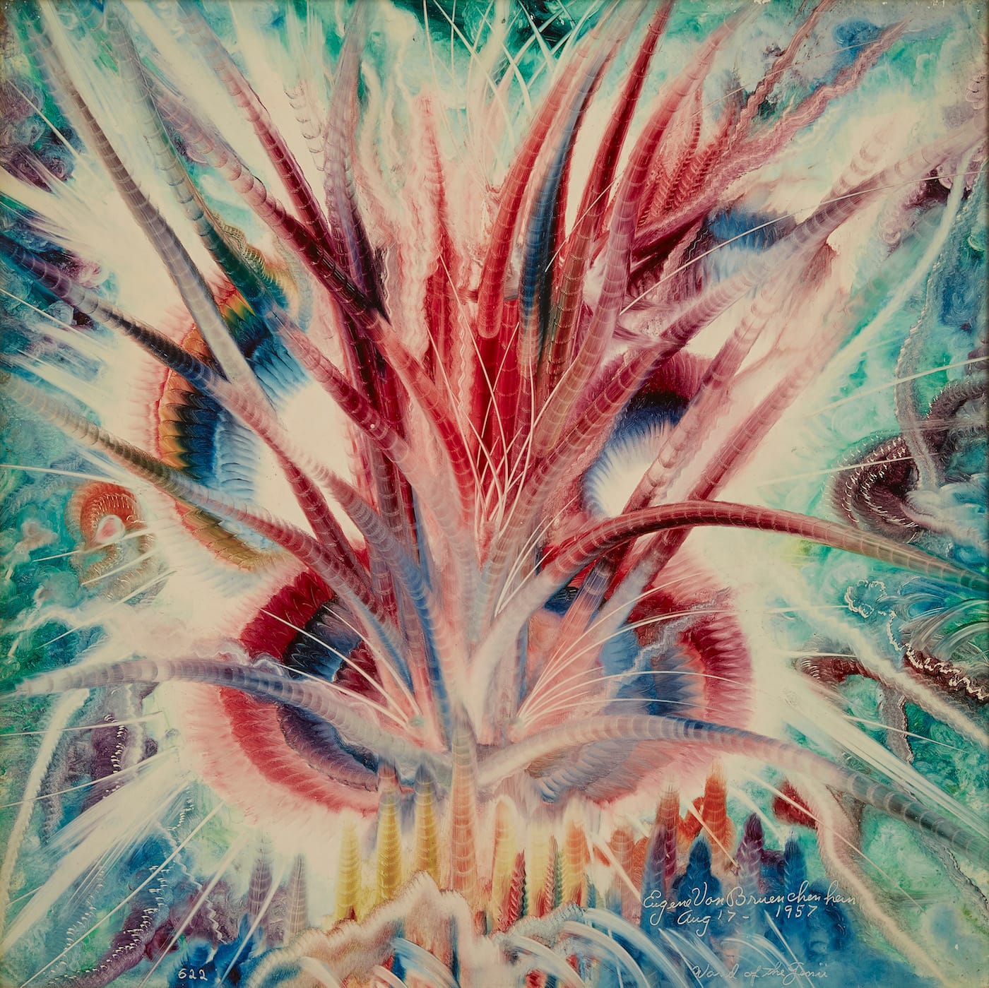 On display in one of the show’s vitrines is a small, government-issued form from 1945 indicating that Von Bruenchenhein had been rejected as physically unfit to join the armed forces. However, he seemed deeply concerned about humankind’s Cold War follies and its ability to destroy the planet, as evidenced in an unusual group of paintings from the 1950s of hydrogen-bomb mushroom clouds.