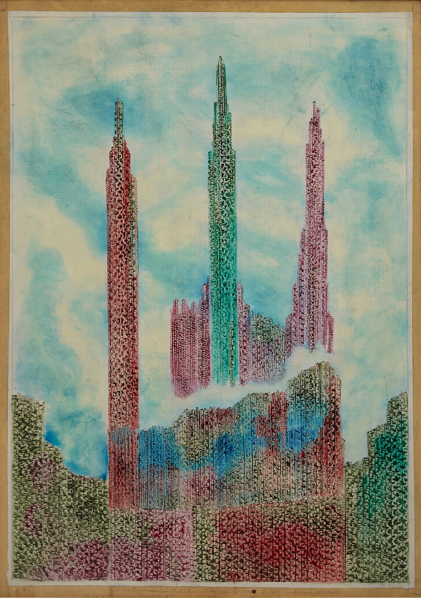 Noting that these images depict high-rise structures that appear “[m]ore grown than constructed,” Stone explains that he produced them by “dipp[ing] the edges of pieces of corrugated cardboard — the open sides that reveal the inner, wavy support layer — in paint” and then dragging them in across “enameled sheets of corrugated cardboard.” In these pictures, she observes, Von Bruenchenhein’s “masses of upright forms display a lacy gridwork that emulates building blocks, a pleasing solution for creating the illusion of the complexes of his new architectural age.”