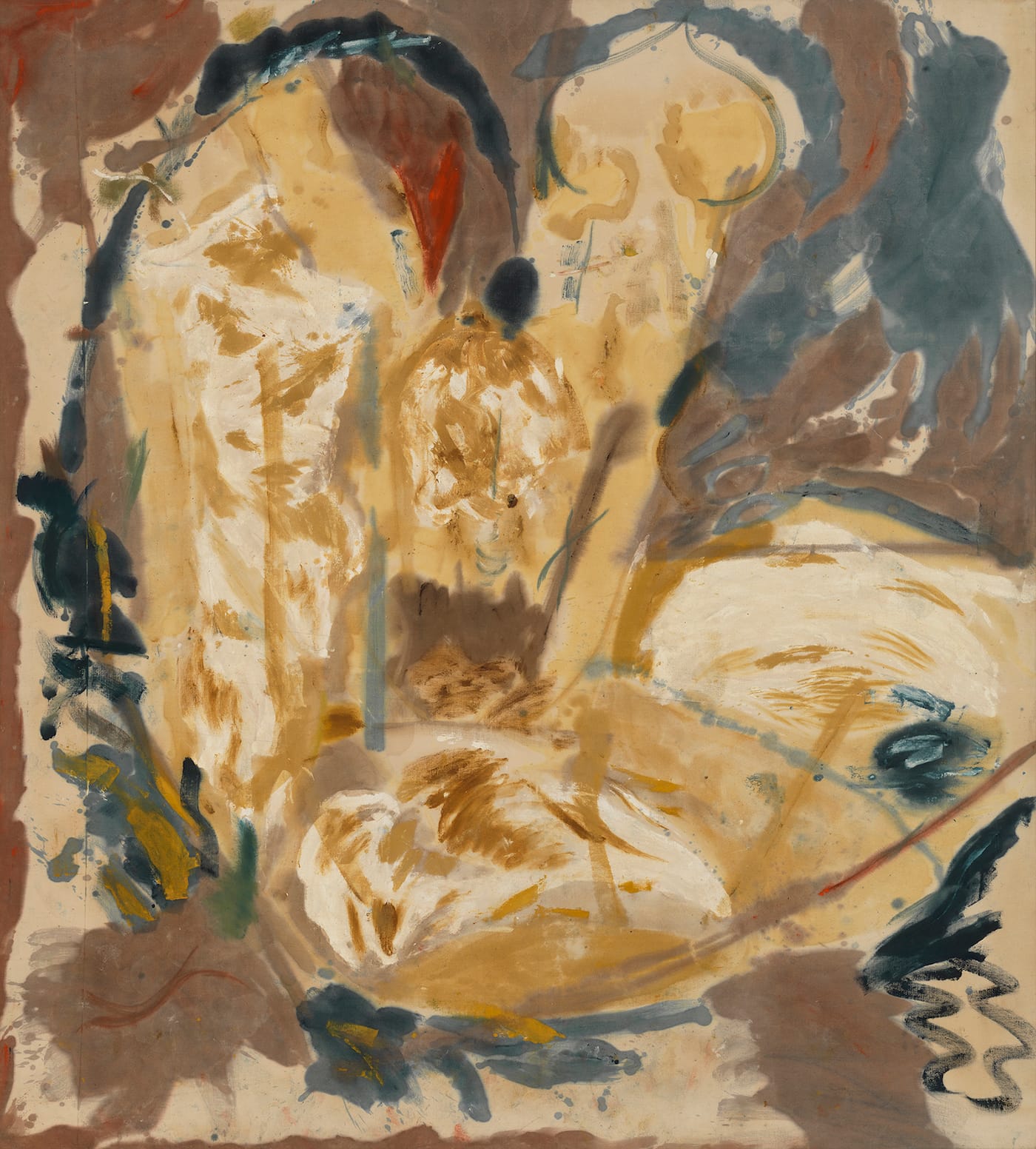Next along the timeline is “Giralda” (1956), a bona fide “soak-stain” oil painting whose explosive, earth-toned composition includes a sketchy depiction of the Giralda bell tower of the Seville Cathedral in Seville, Spain (here rendered as atilt as its Pisan counterpart, though it doesn’t lean in real life). Frankenthaler curiously tops the tower with an onion dome rather than the Renaissance lantern it now flaunts, evoking its original incarnation as a minaret. (A nod, perhaps, to Matisse’s Tunisian period?)