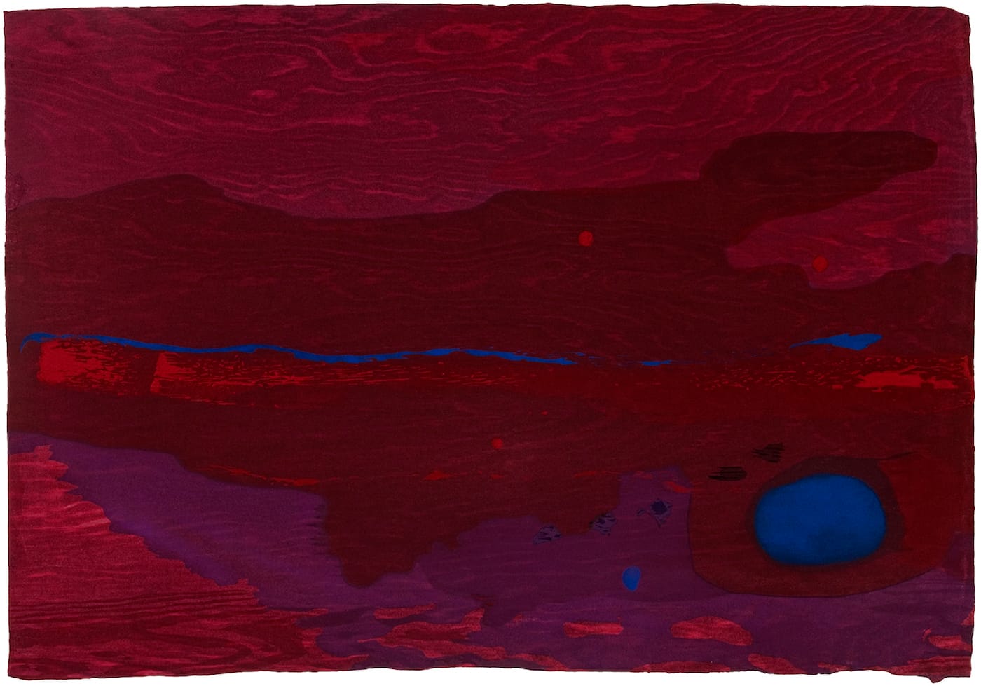 And yet Frankenthaler did not intend these prints to be mistaken for paintings, making a point to emphasize the wood grain in the base layer of a number of works, including the series, “Tales of Genji” (1998), “Madame Butterfly,” and the intensely red, blue, and purple “Japanese Maple” (2005) — going so far as to create trompe l’oeil wood grain where the natural impressions weren’t visible enough.