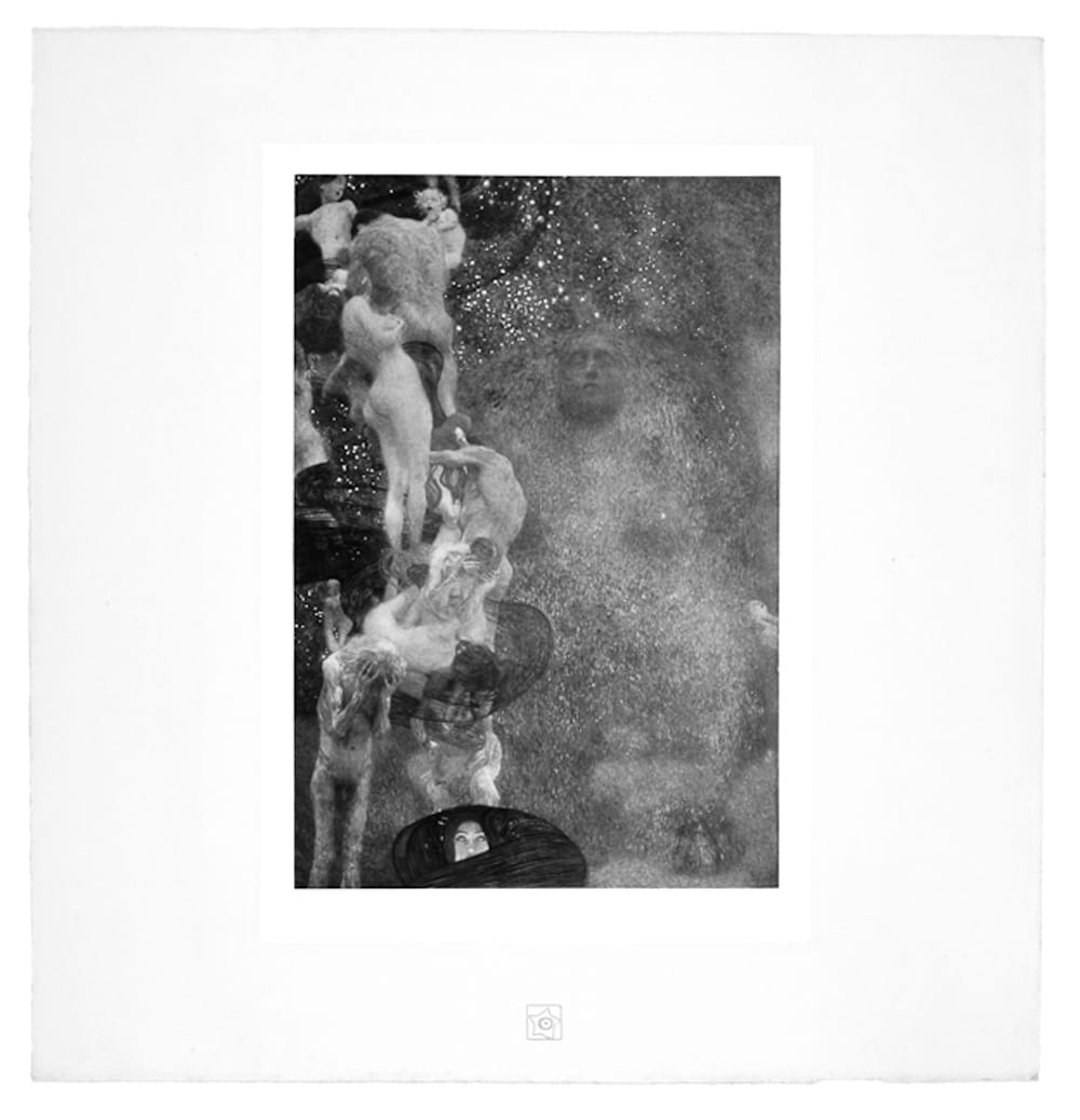 Jason Jacques is showing 15 examples, including big hits such as “The Kiss” and “Judith and The Head of Holofernes.” Not to be missed, however, are three collotypes of destroyed paintings that sparked the largest controversy of Klimt’s career: “Philosophy,” “Medicine,” and “Jurisprudence” were smaller prototypes of a massive work the artist designed for his commission to decorate the ceiling of the University of Vienna’s Great Hall with allegories of those faculties. But his ruminative visions of nude women were deemed pornographic and too fanciful for such a public, erudite setting. The paintings ended up at Immendorf Castle, where they were destroyed in a fire set by German SS forces during World War II. Along with Klimt’s preparatory drawings and photographs, the small, shadowy collotypes of drifting, languid bodies are all that remain of the never-realized mural. They’re records not only of what could have been but also of the criticism Klimt faced during his lifetime from a more conservative society.