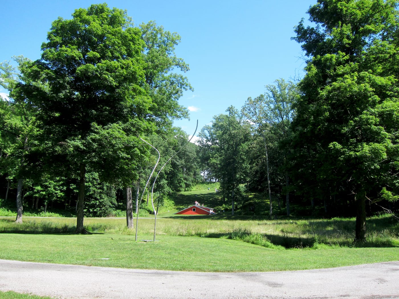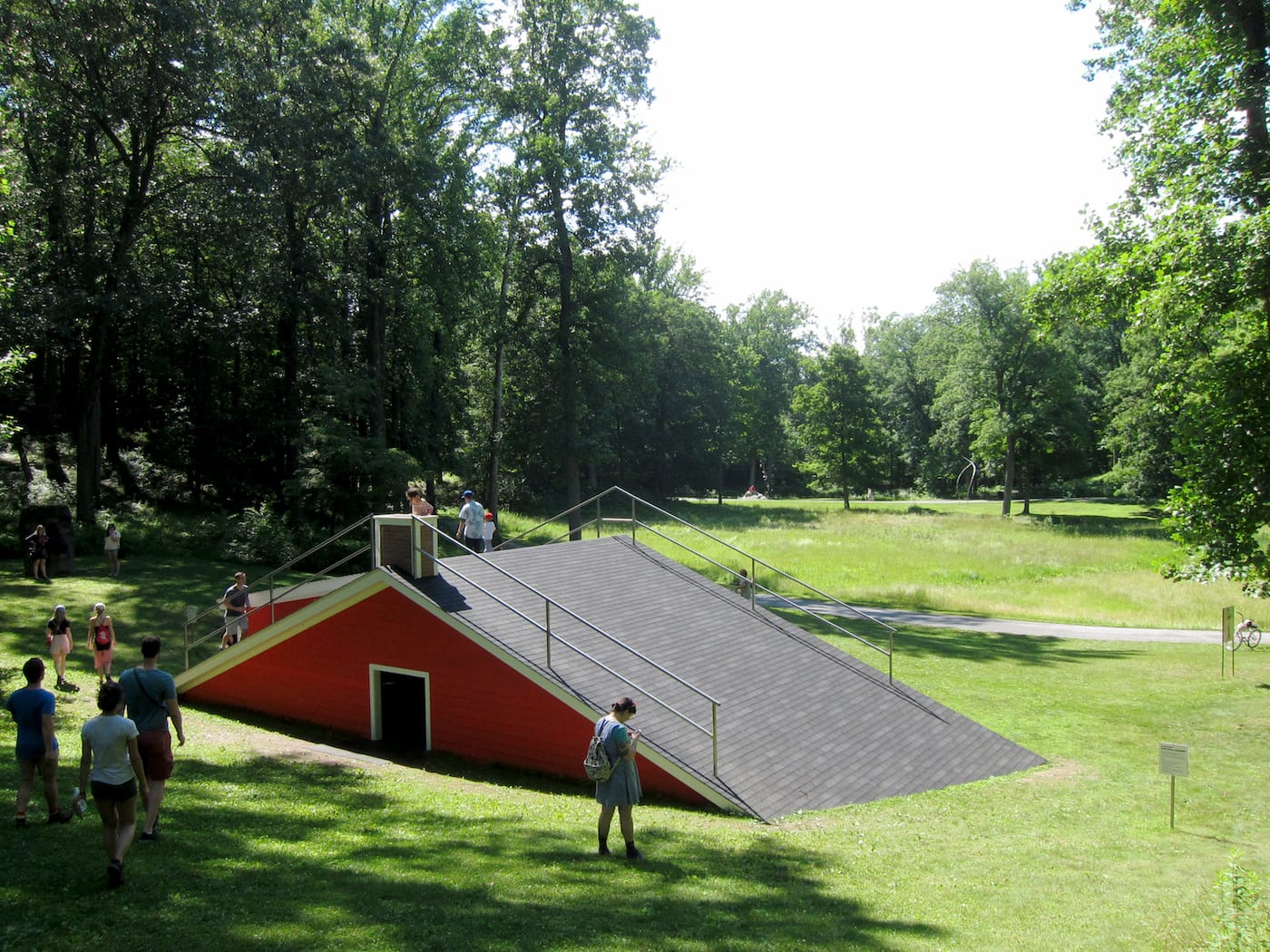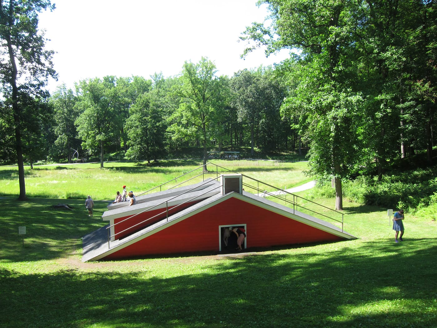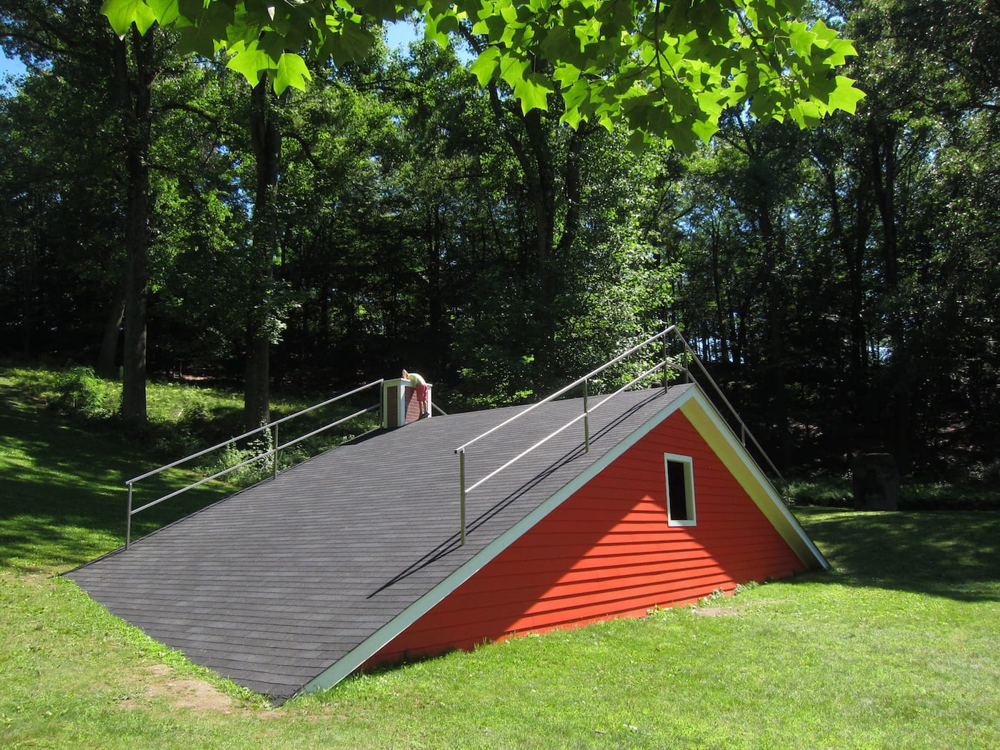 Unlike the other artworks scattered throughout Storm King, Hart’s piece is less a sculpture and more of a site. It is the first iteration of Storm King’s Outlooks series (which invites emerging or mid-career artists to create new projects for the Center’s open season) that is specifically activated by programming and public participation. Visitors can climb up its roof to lie down and relax, or nudge themselves through a window to enter the shaded area.