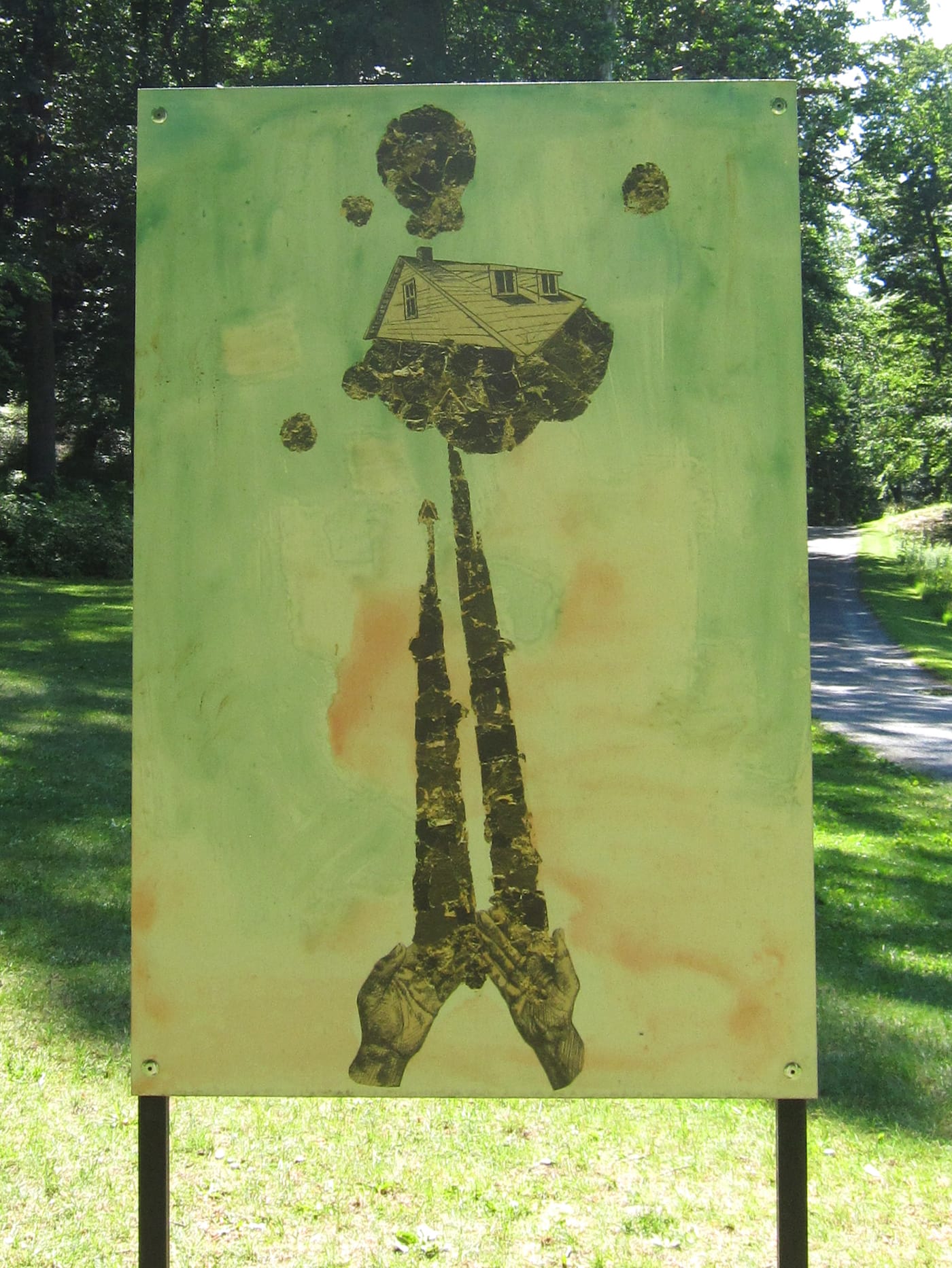 To Hart, an isolated roof, as a space of in-betweenness, is an apt site in which to listen and to learn about these non-dominant, often unspoken narratives. “The Oracle of Lacuna” appears as buried yet growing, a sheltered sanctuary that is still exposed to the public. It is one of a number of roofs she has created following installations at Seattle’s Olympic Sculpture Park and The Brooklyn Museum (both of which also involved site-specific narratives). Hart has previously referred to the rooftop as a site where people can reclaim power and identity; she evokes this sentiment in a drawing, affixed to a signpost next to the house, in which a roof rises above a pair of open hands, seemingly shooting out into the sky. It is like an oracle a person releases, with complete control, out to the world.