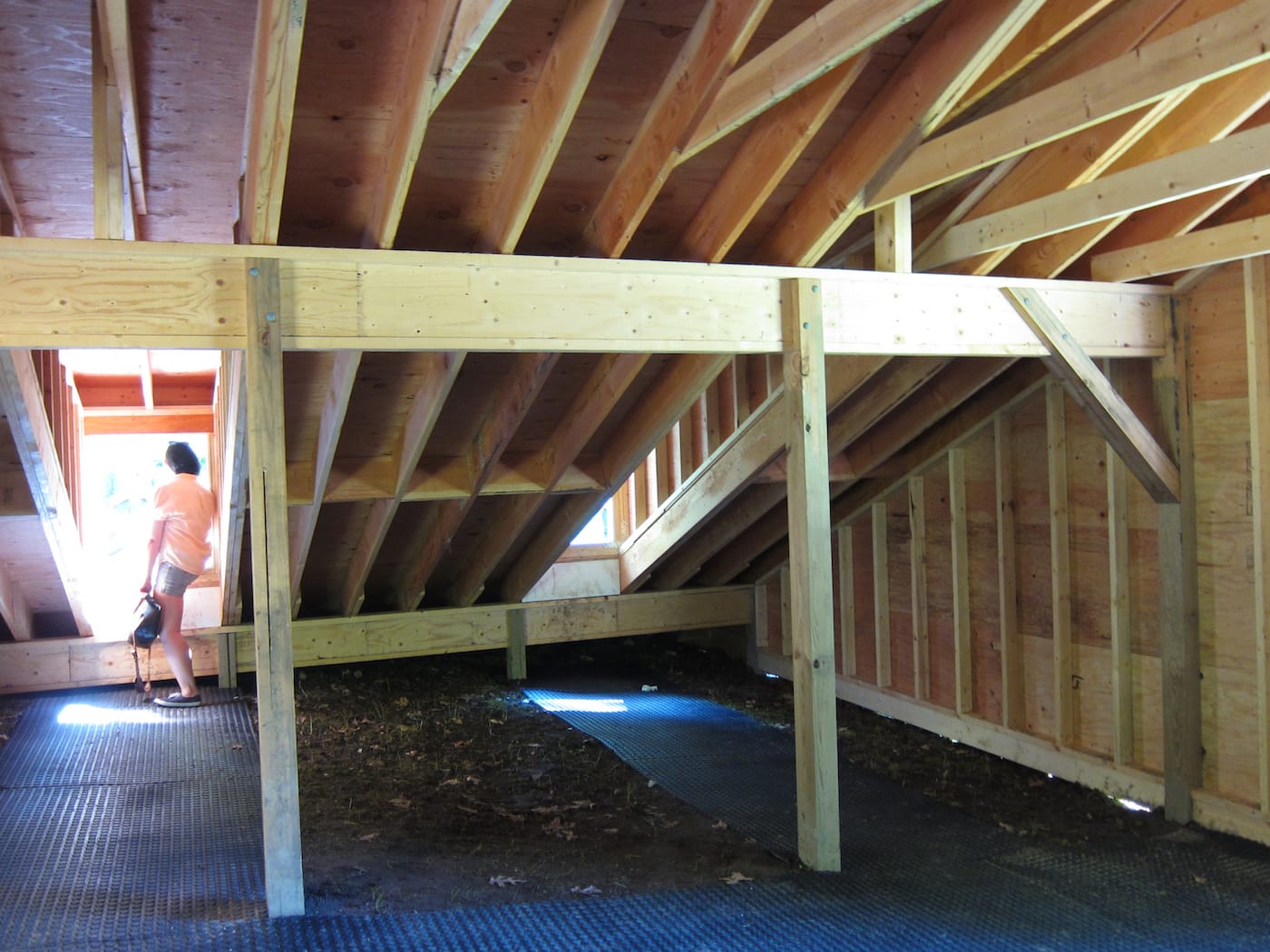 Inside, though, is not what you might expect: far from homey, it is a raw space, with exposed wooden beams crisscrossing over your head. Near a central window is an iPad, where visitors can select and play recordings of roundtable discussions Hart held with residents from the park’s surrounding communities, historians, and Storm King administrators. The artist had presented each roundtable with prompts, from the broad — “What comes to mind when you think of a rooftop?” — to the specific — “What was the impact of the Stern Family and thus Storm King on this area?” or “What are the some of the communities that surround Storm King?”