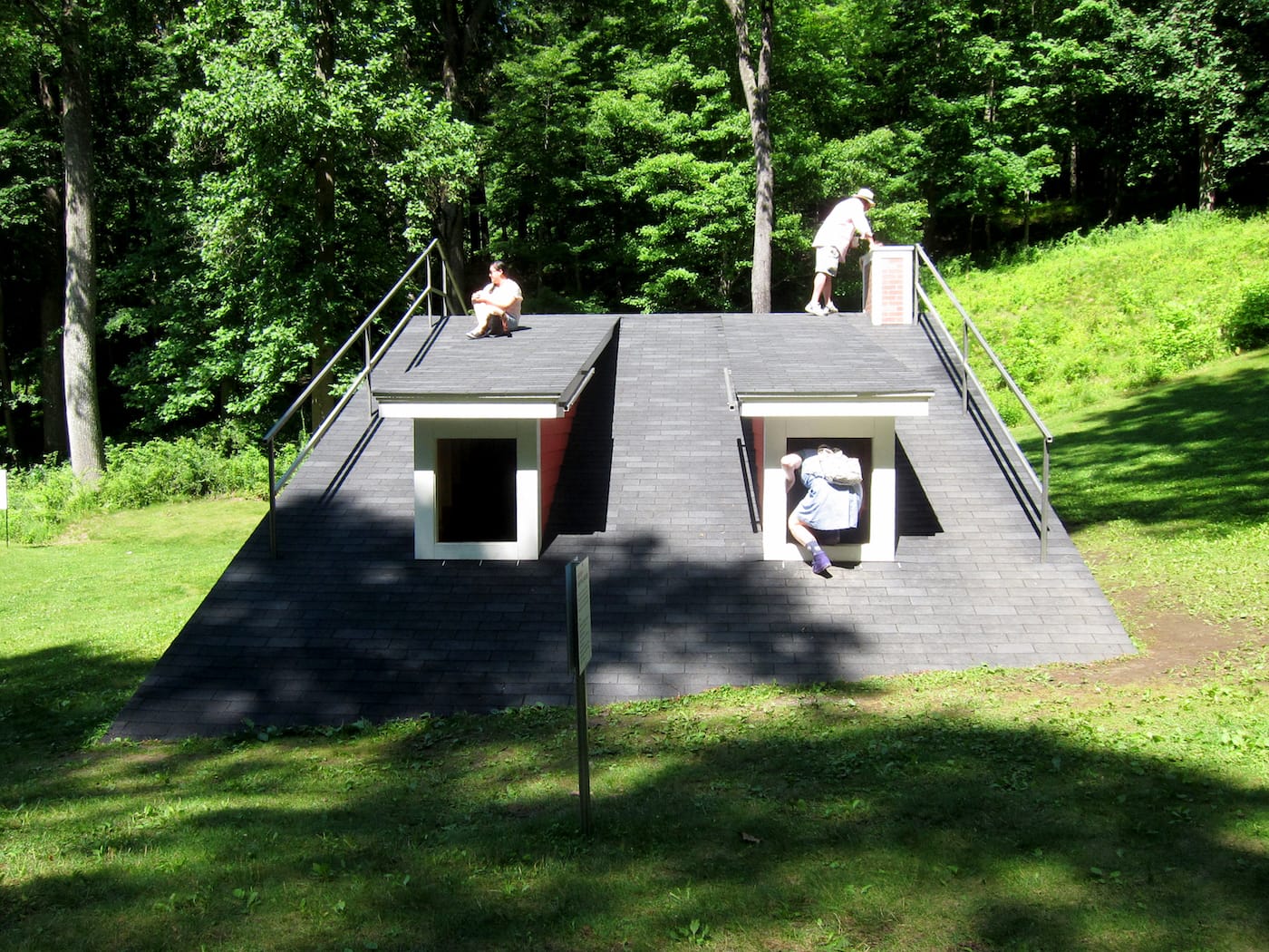 At Storm King, the house is like an attic one might have explored as a child, except that, instead of dusty boxes, Hart offers an archive of voices. It’s a much more inviting version of another roof on Storm King’s land, Alice Aycock’s “Low Building with Dirt Roof (for Mary)” (1973/2010), which seems more like a hideout for one than an open, communal space. Hart’s roof provides access to oral histories that visitors to Storm King might otherwise never learn about, much less hear in person. In her transformation of this spot of earth, she is unearthing stories too, so that when we exit this house, we leave with a changed perspective toward the land beneath our feet.