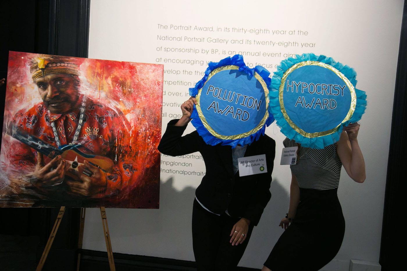 LONDON — The National Portrait Gallery’s annual portrait prize exhibition gained an extra exhibit last night thanks to an intervention by BP or Not BP?, an anti-British Petroleum (BP) artist protest group. The BP Portrait Prize is an annual public competition that has run for 37 years and has been sponsored by BP since 1990. The protest was one of many staged events against BP’s involvement in the arts in recent years by BP or not BP? and other members of the Art Not Oil Coalition.