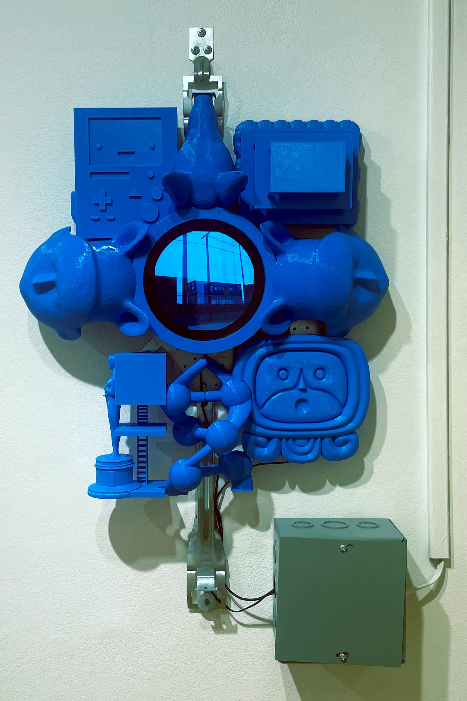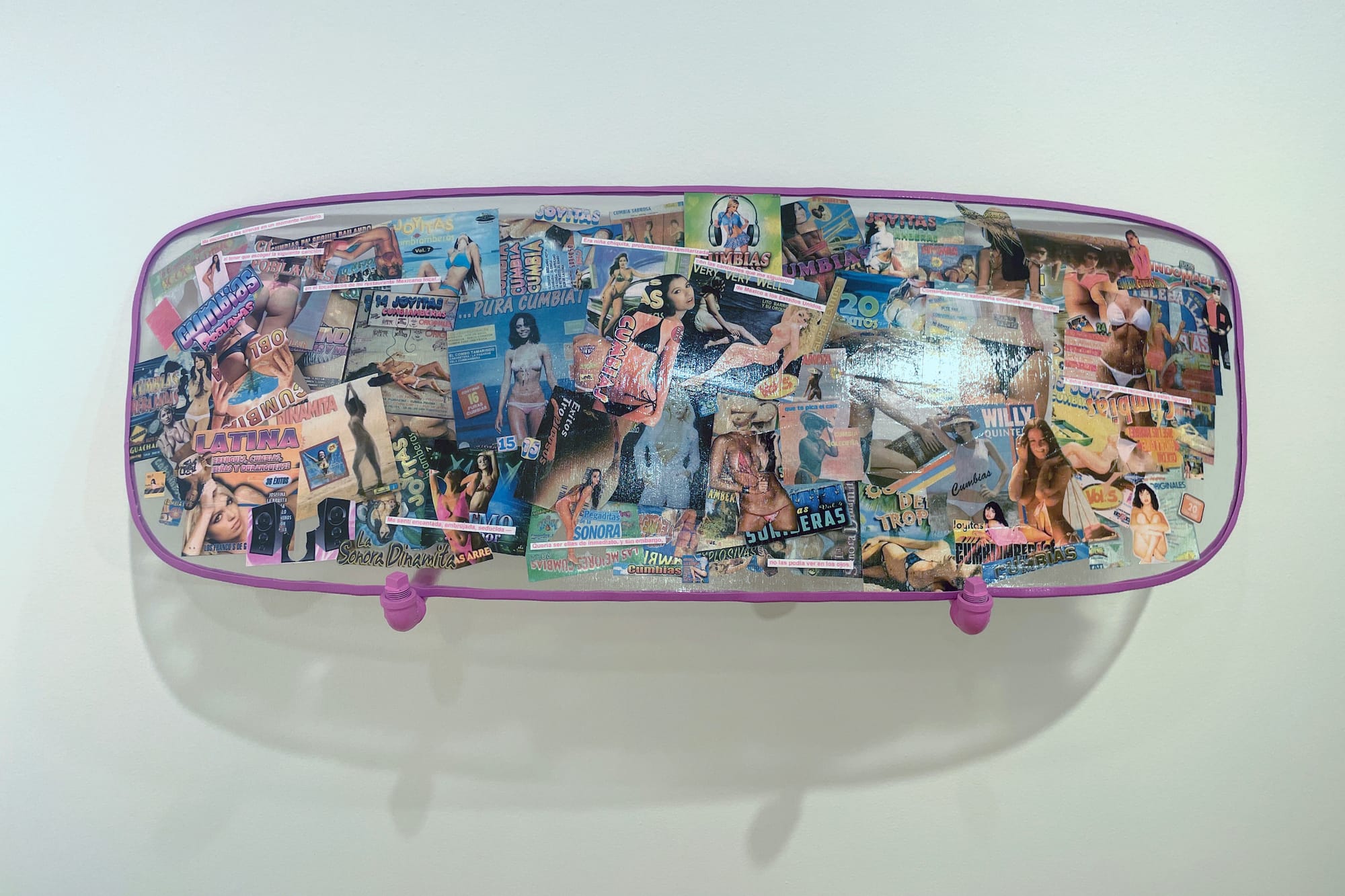 The exhibition blends symbolism with pop culture, building kinship with the audience. There’s joy in seeing Beemo, the anthropomorphic gaming console from Adventure Time, and an Oscar statuette alongside a Mayan glyph in Adrian Alfaro’s “Chunk” (2024) — or, for those who grew up between Mexico and Los Angeles, in recognizing the bikini models on the cover art for a type of dance music, cumbia, which Alexa Ramírez Posada has collaged over a fiberglass windshield cover in “Cucucucumbia” (2024).