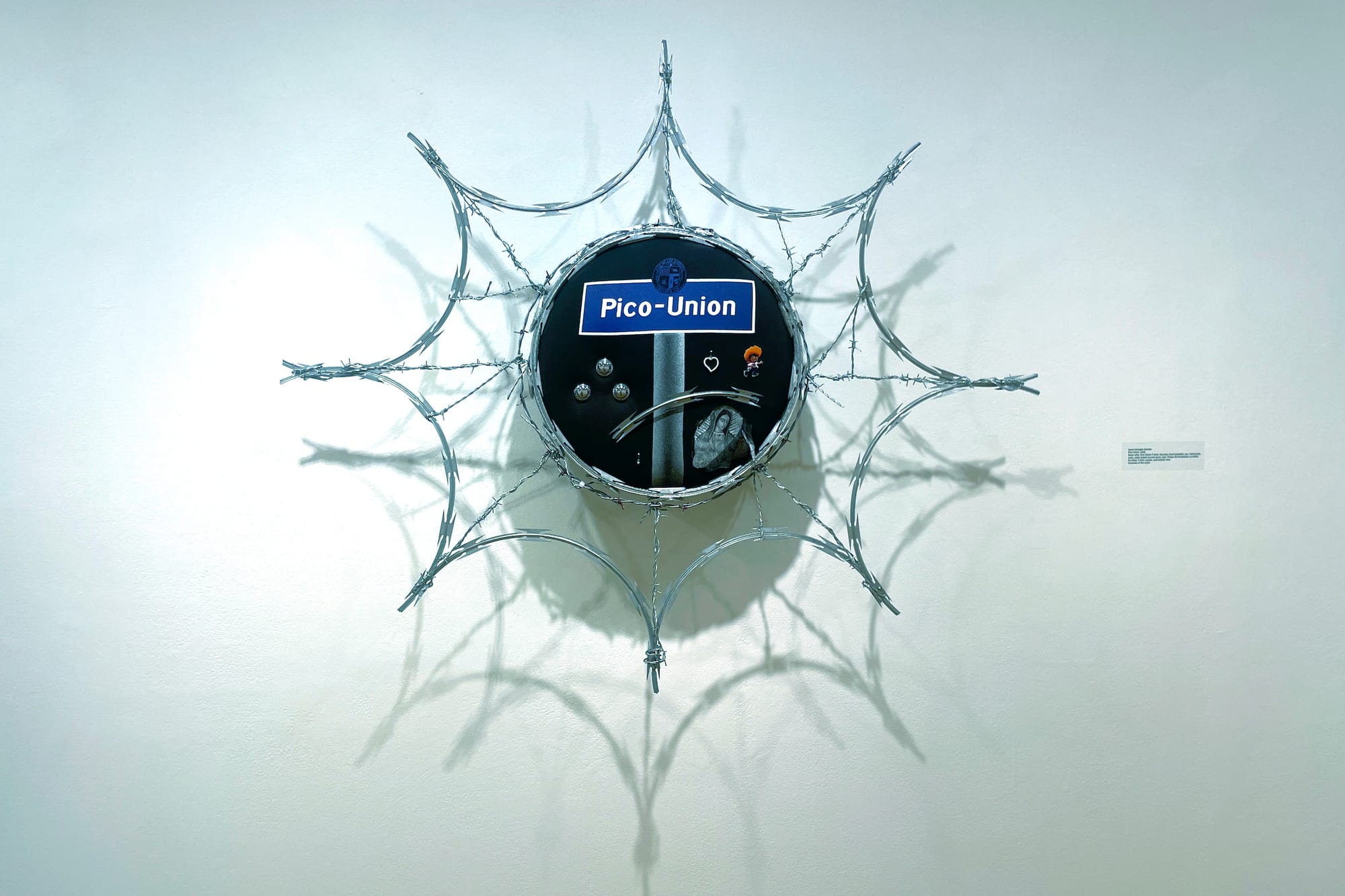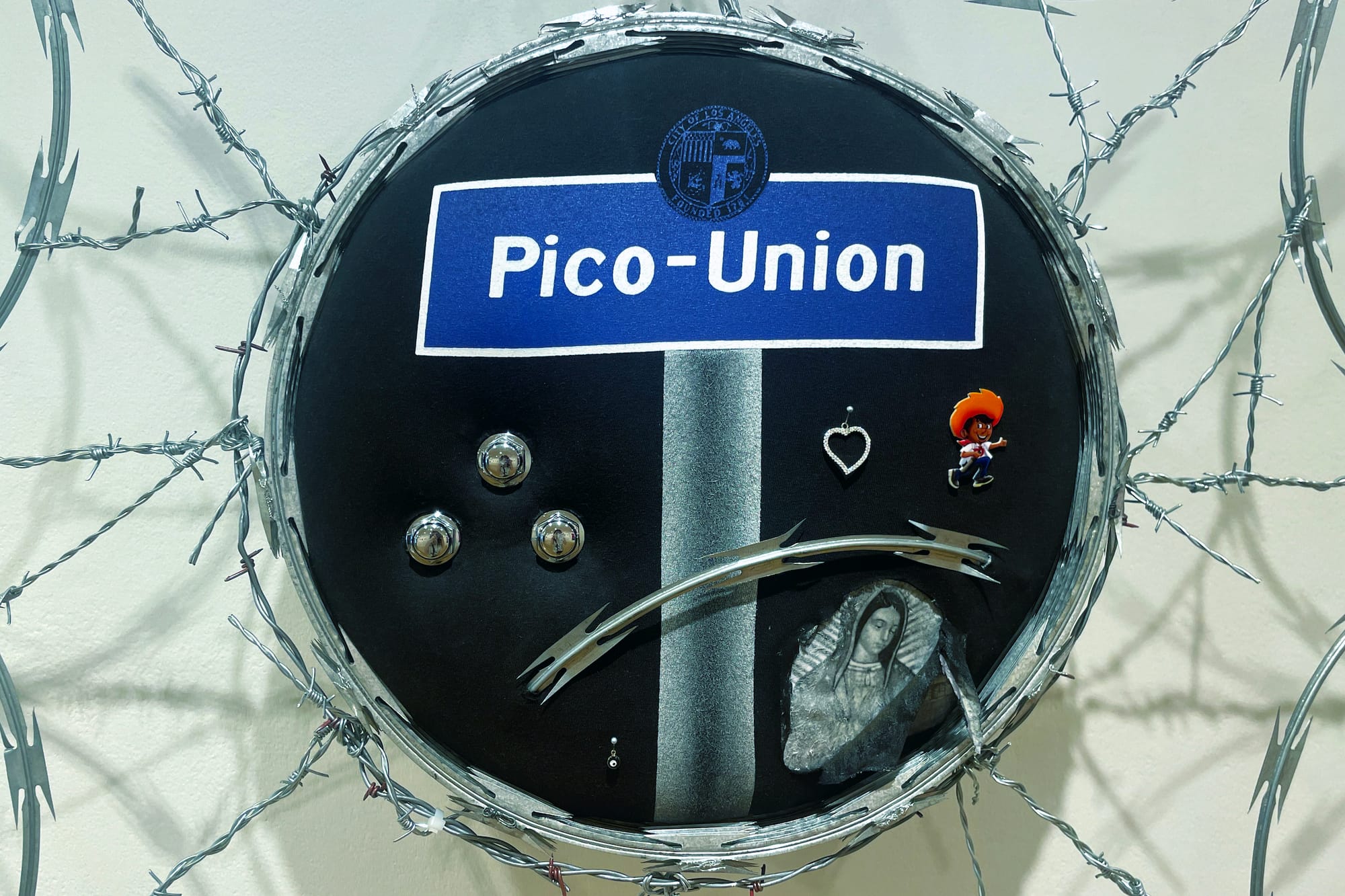 LOS ANGELES — There's something uncanny about the Pico Union street sign printed onto a black t-shirt. Its typeface doesn’t quite match the Highway Gothic stamped onto all standard roadsigns, giving it the aura of a bootleg. The circular canvas that frames the t-shirt invokes the wheel of a lowrider, a reading punctuated by three silver lug nuts that protrude from the surface. A web-like star of barbed wire branches out from the wheel, and a single rhinestone heart earring embellishes the shirt, along with a cartoonish boy in a spiky sombrero; a cut in the fabric reveals a swath of a Pro Club t-shirt featuring the Virgen de Guadalupe gazing downward with a sad expression.
