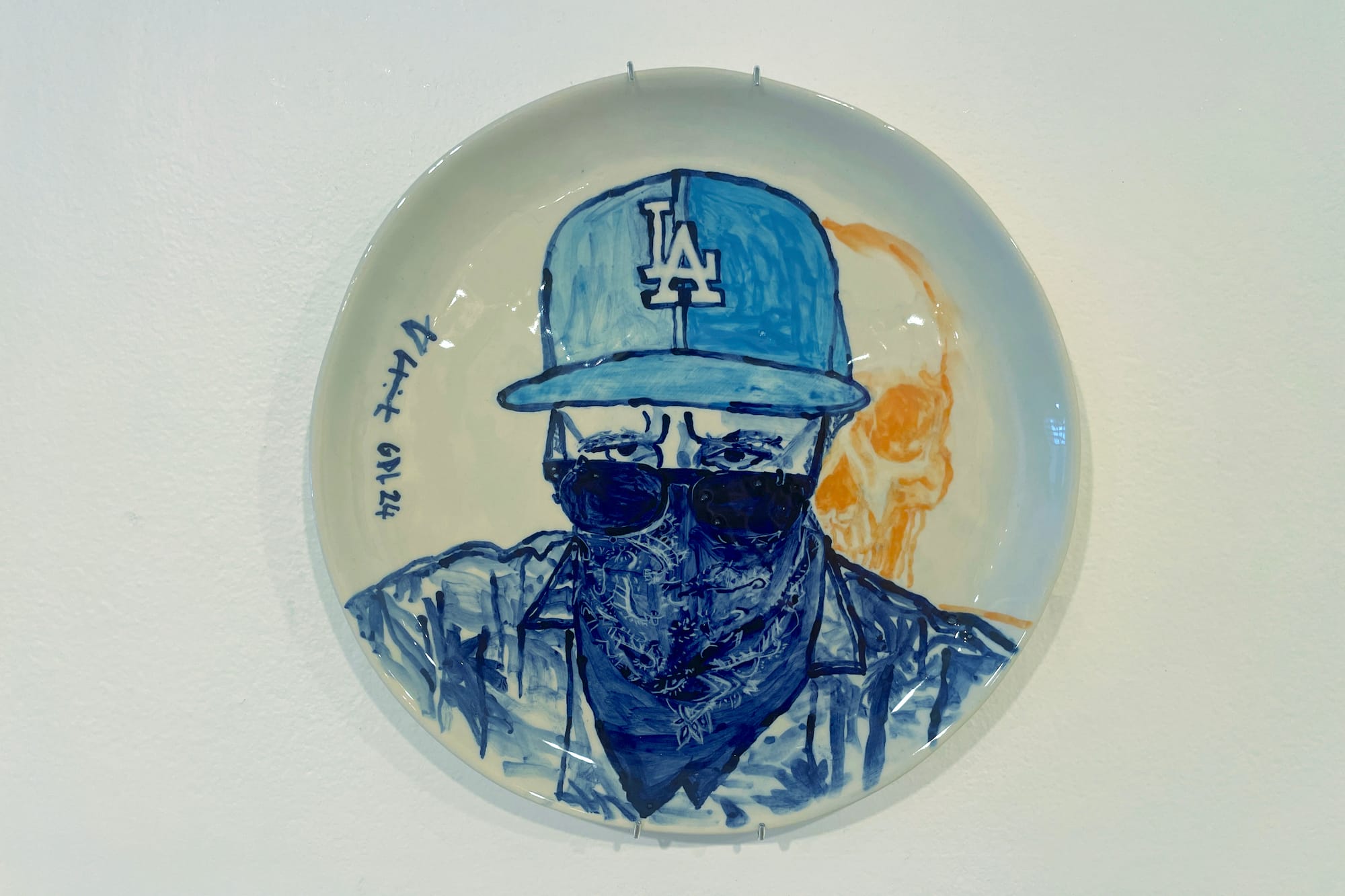Aaron Douglas Estrada’s “Pico Union” (2024) represents the urban and unapologetically Chicanx style that defines 3B Collective, which shines in its exhibition Highway Hypnosis at Craft Contemporary. 3B Collective, whose membership is continually in flux, is a group of Native and immigrant multidisciplinary artists for whom Los Angeles is part of their identity. They illustrate their affection for the city’s grittier iconography — lowrider culture, Dodgers fandom, gang colors, loose dogs — through traditional Mexican crafts, like ceramics and textiles, which are often fabricated by artisans in Latin America.