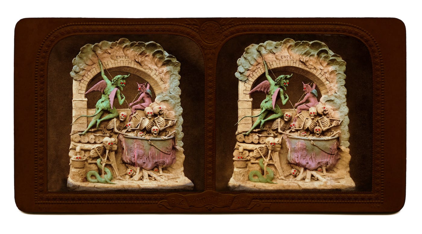 It’s almost overwhelming to attempt to describe the over 60 artworks covering a period of 175 years that make up this show. And everyone will find his or her personal favorites. Mine included Marcel Duchamp’s “Rotoreliefs” from 1935/1965, with their spinning, vertiginous-inducing visions (similar to what Alfred Hitchcock would later use in his film, Vertigo), Simone Forti’s “Striding Crawling,” a Multiplex Hologram image from 1975–78, with its curling and twirling figure, Pierre Adolph Hennetier’s “Les Diableries: Enfer” from 1860, and the dancing wallpaper of Peggy Weil, “3D Wallpaper” from 1976/2018.