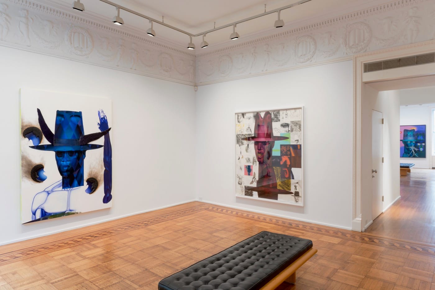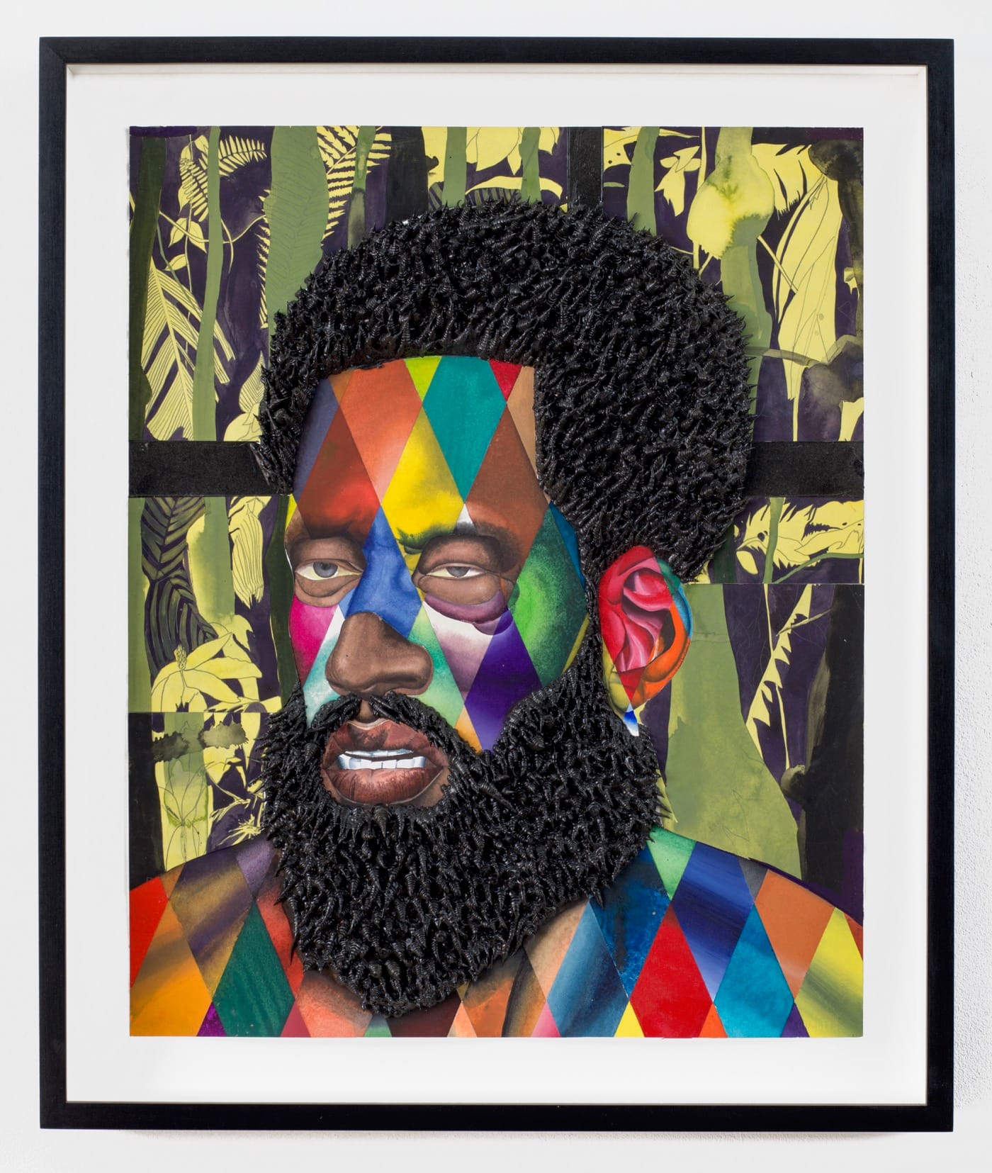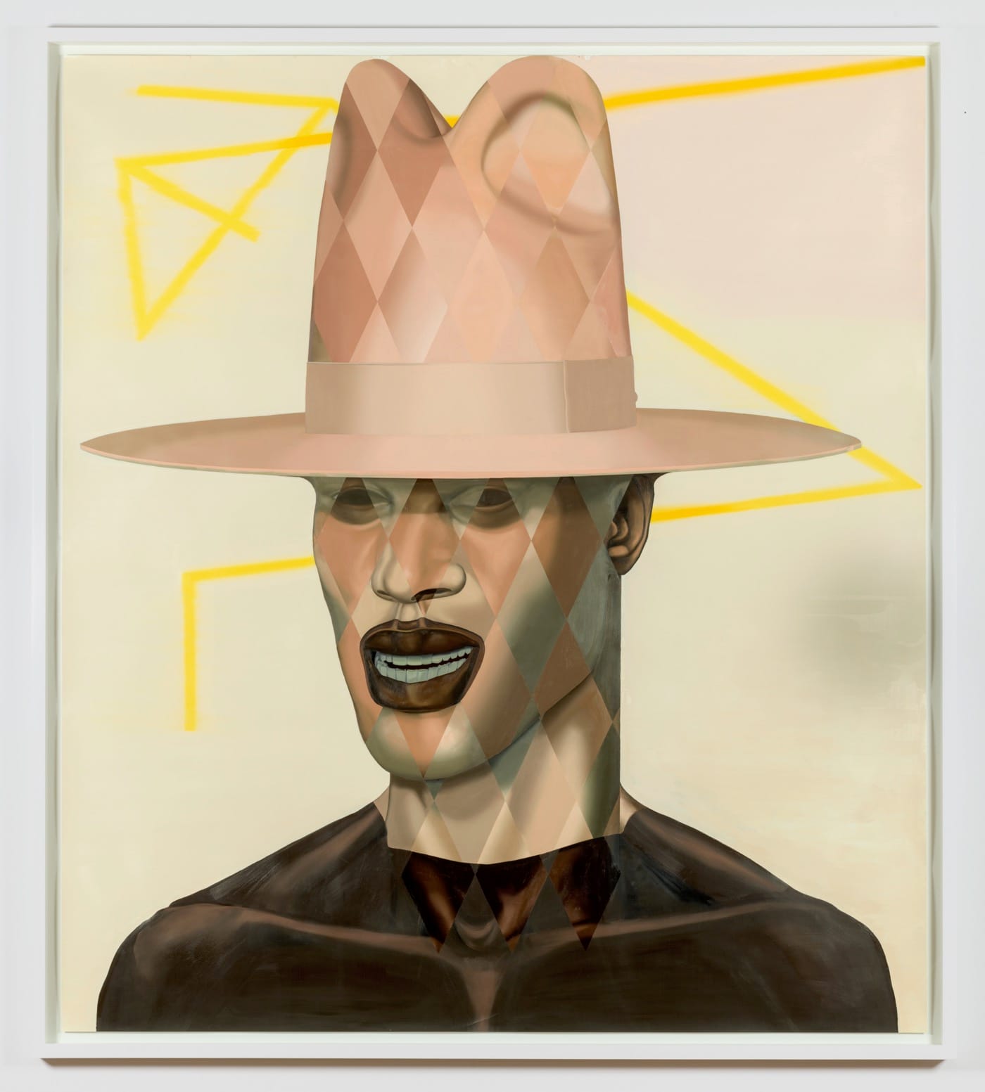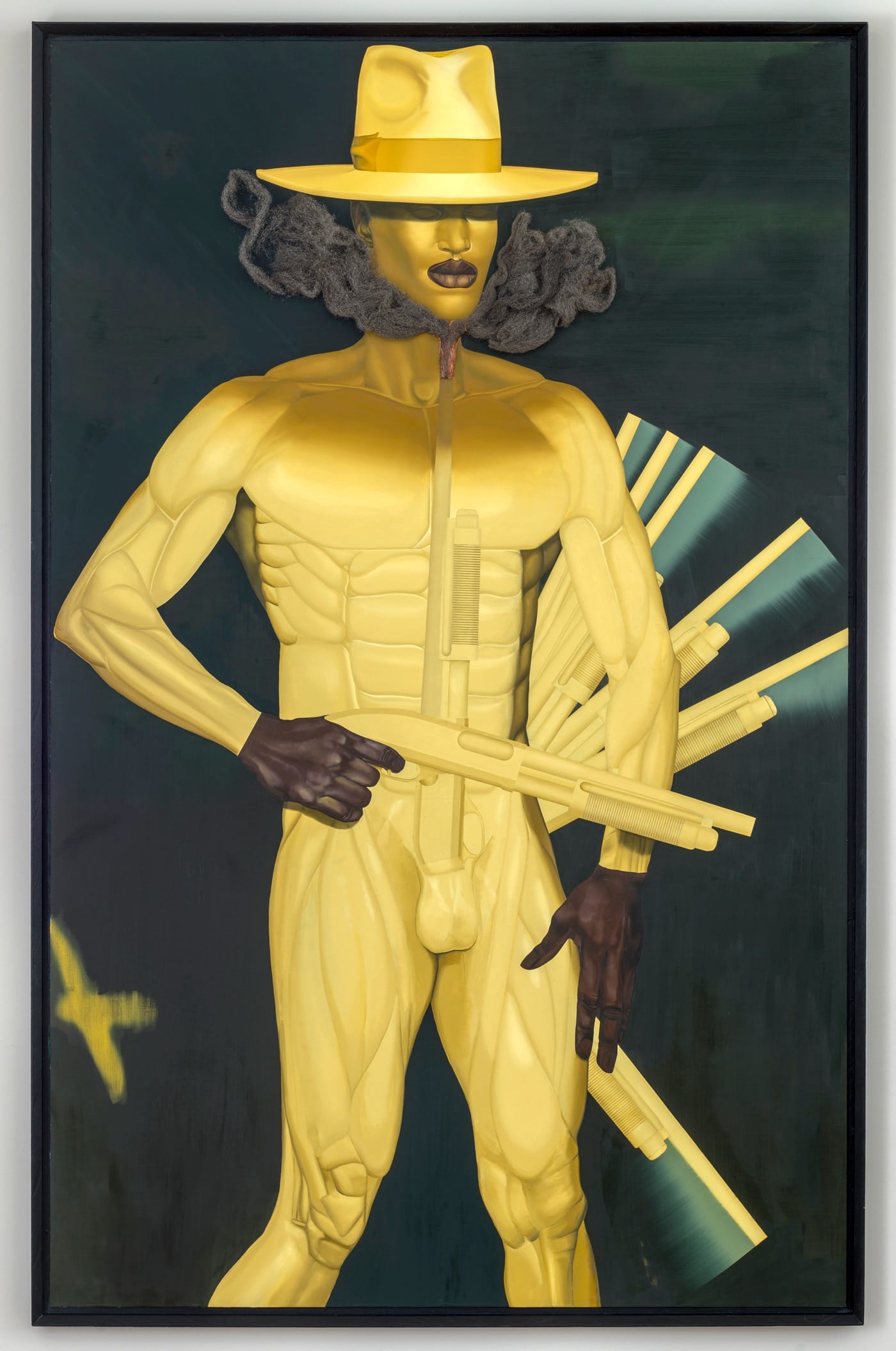 I could take my pick with where I want to start entering the work, but I’m most drawn to the characters. One in particular recurs. He wears an enormous hat, has wide, full, deep chocolate lips and a fey, dispassionate gaze, and his headgear, clothing, and skin are often depicted in a harlequin pattern. In some cases his face is like stone, in others it displays a smile like a deranged grimace in its infancy. I don’t know what this character is, but he’s part superhero, part trickster figure, and part Delphic oracle, with a touch of Ru Paul. But I still don’t think this description sufficiently captures how uncanny he is, how much he exceeds the templates I’ve suggested. I felt so curious I asked the artist how the character came to be, and Sonhouse replied that he took the harlequin pattern from Picasso, but the rest consist of an amalgam of images from men’s fashion magazines. In “Repeat Offender”(2017), more of his body is depicted than in the other paintings, and here it is wrapped in a skin-tight yellow unitard with a superhero’s musculature showing through. He is extravagantly weaponized. He holds a shotgun in one hand; others twirl behind him, and his penis is itself a shotgun facing upwards, aligned with his torso. It has seemingly just been discharged straight underneath the figure’s chin and jaw, producing a cloud of smoke that emerges from the painting as steel and copper wool affixed to the canvas. Researching older work of his I realize that Sonhouse has applied steel wool to his paintings before, in various ways. However, seeing for the first time in person this kind of melding of coarse materials with smoothly sleek paint in a surreal narrative of psycho-sexual, perhaps onanistic drama that (refreshingly) focuses on black characters, I have to imagine that in his paintings anything can happen.