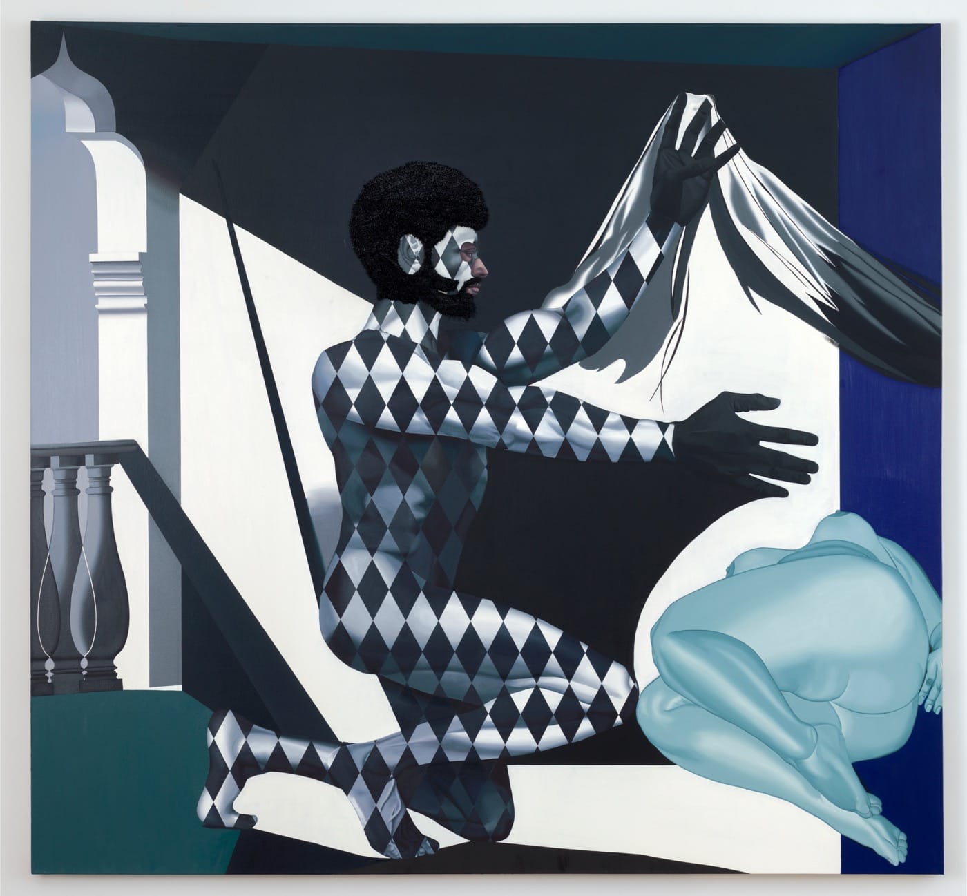 In terms of the workmanship, Sonhouse’s style is so clean it verges on being illustrative. I didn’t see any brush strokes. This works for him because the characters and scenes are so exactingly and beautifully rendered that the works become rabbit hole illusions I’m happy to fall into. More, throughout the exhibition Sonhouse blends his concocted surreal scenes with inventive, painterly surprises. For example, in “Wobbling Occupants Ripe for Distortion” (2017) a shadow becomes a hem of drapery that the main character, whose skin is completely harlequined in black and white, lifts up to reveal a nude female figure. The surprise is in the character’s hair and beard which is made into a three-dimensional shrub built up from the canvas with acrylic gel — it gets the visual attraction of thick, black, negro hair correct. The painting makes me think that when the term “black is beautiful” was first uttered, someone was likely looking at an afro in full bloom glistening in the sun.
