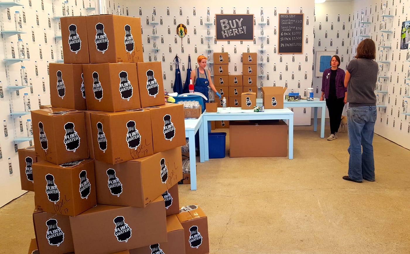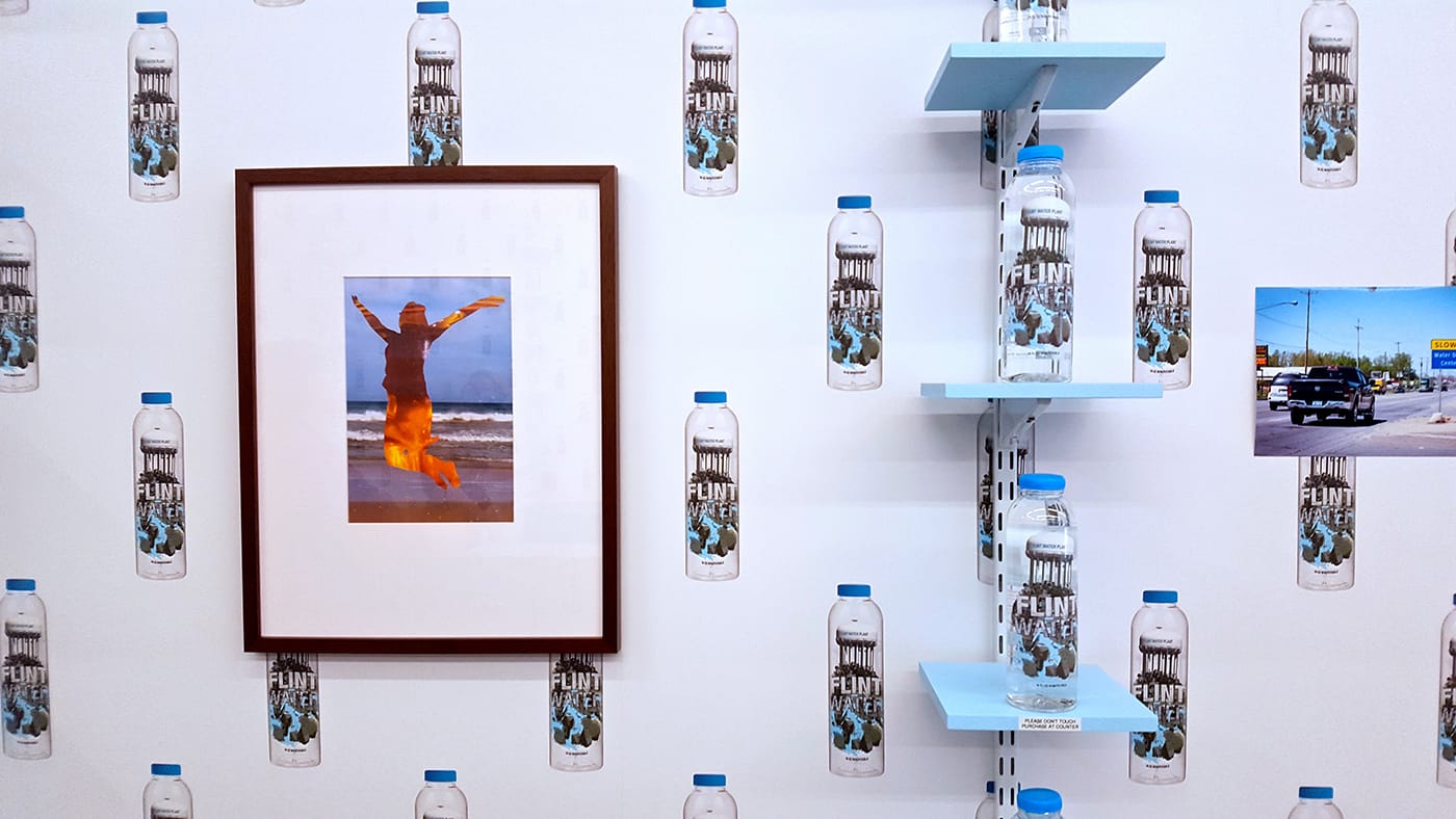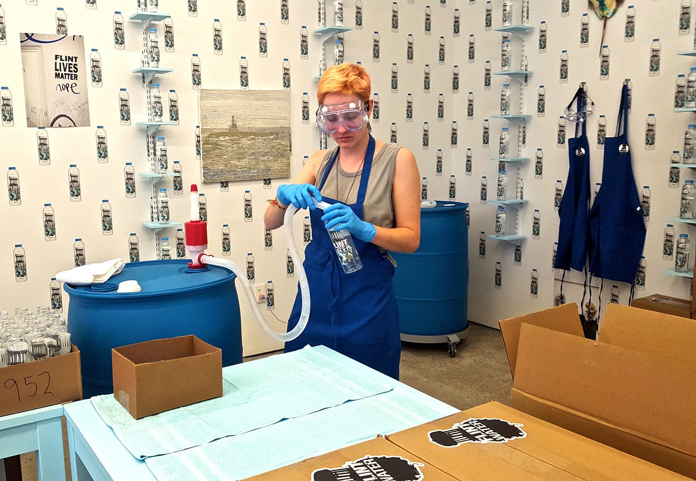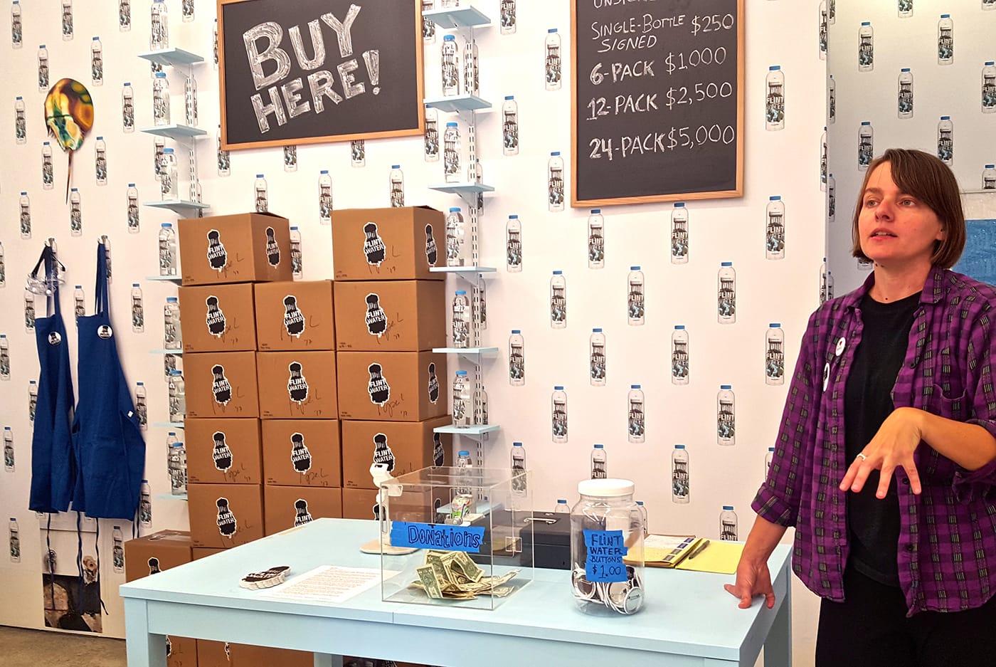 The famed social practice artist sells bottled water out of a Detroit gallery to highlight the continuing emergency.