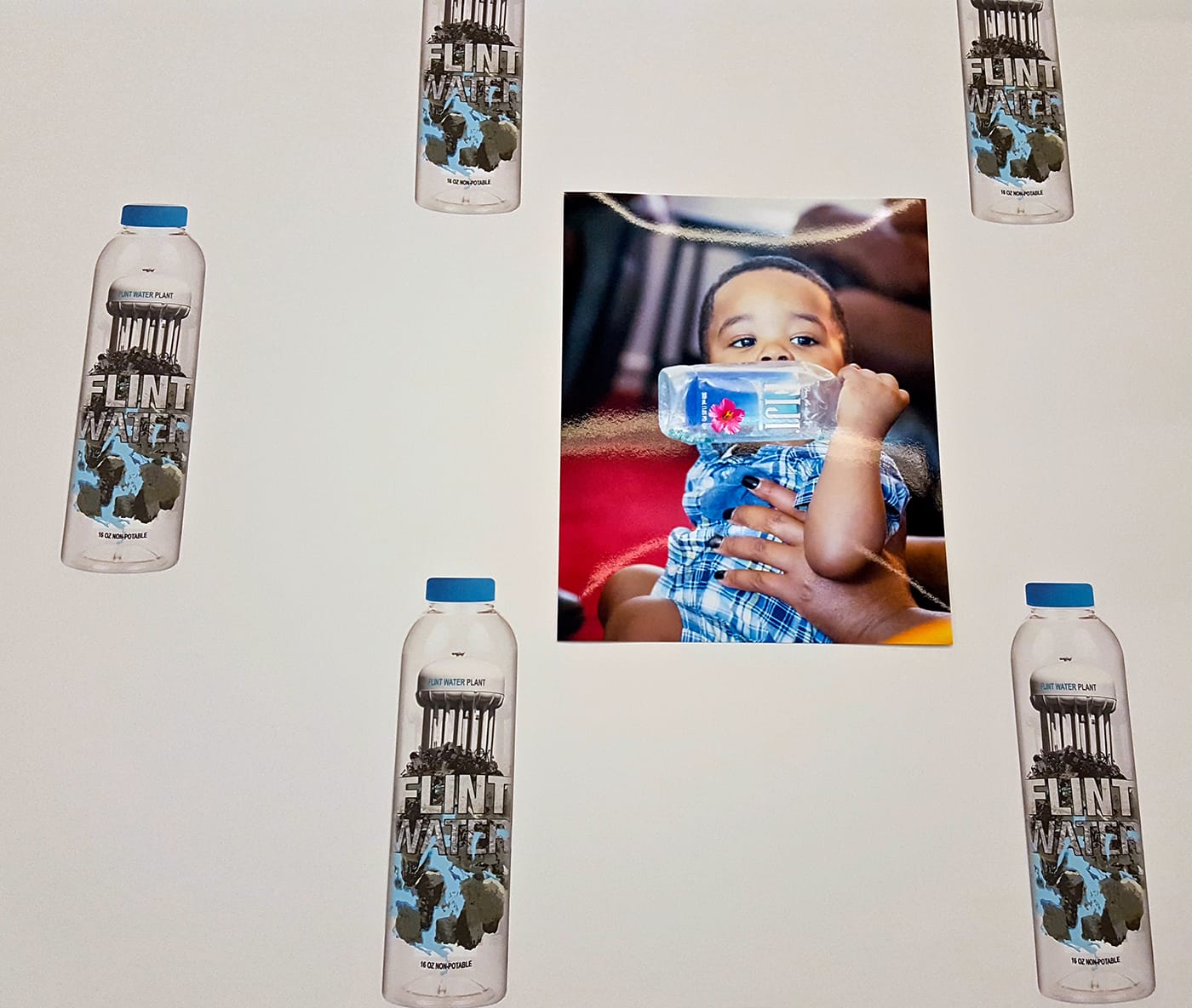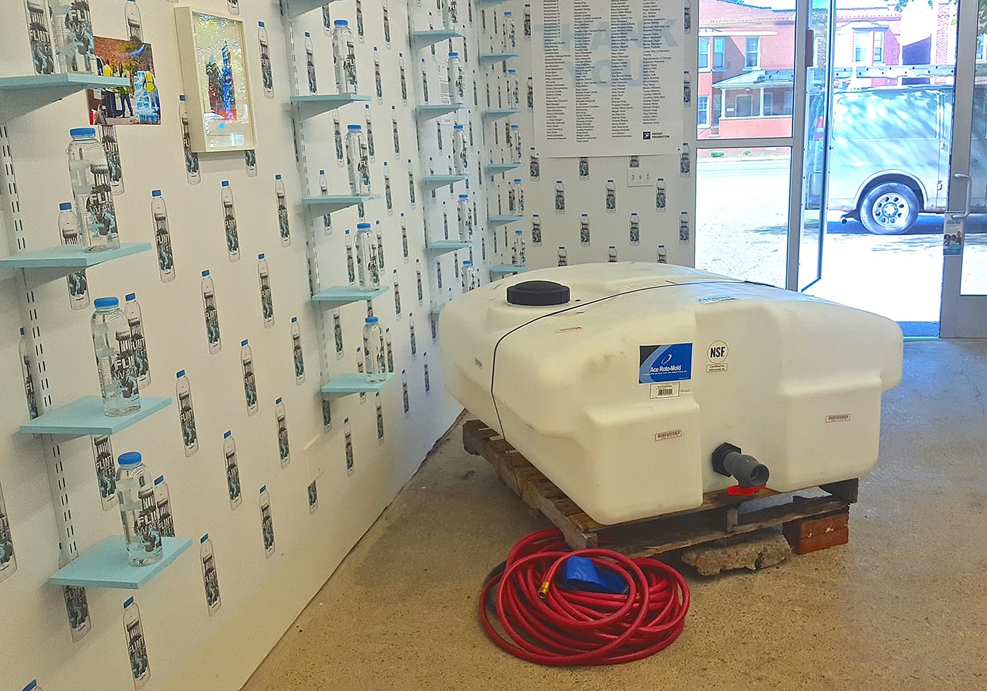 The contacts were made possible through the support of What Pipeline, which applied for the initial Knight Arts Challenge grant funding, and raised the necessary matching funding for the project through a successful Kickstarter campaign. Using the inroads forged by WP and cultivated by Pope.L in July, as he began his work in Flint, the gallery was able to source water directly through the home of Flint resident Tiantha Williams and put it up for sale in a “Flint Water Shop” installed in the gallery’s location in Southwest Detroit. The walls have been papered with images of Pope.L-branded Flint Water bottles, interspersed with single shelves featuring dozens of the actual water bottles for sale. A retail counter and filling station are set up, staffed by an attendant live-bottling water out of a rain barrel with a siphon. The truck tank used to transport the water is on display, along with signed boxes of the available wares. An image of Williams’s infant son, Taylor, hangs on the gallery wall — he was exposed to Flint water, and though it is too soon to tell the extent of the damage done to his system, there is already evidence to suggest his is part of the human cost of this disaster. This, and other images from around Flint by photographer Eric Dutro, put a face on the human cost of cuts to municipal budgets.