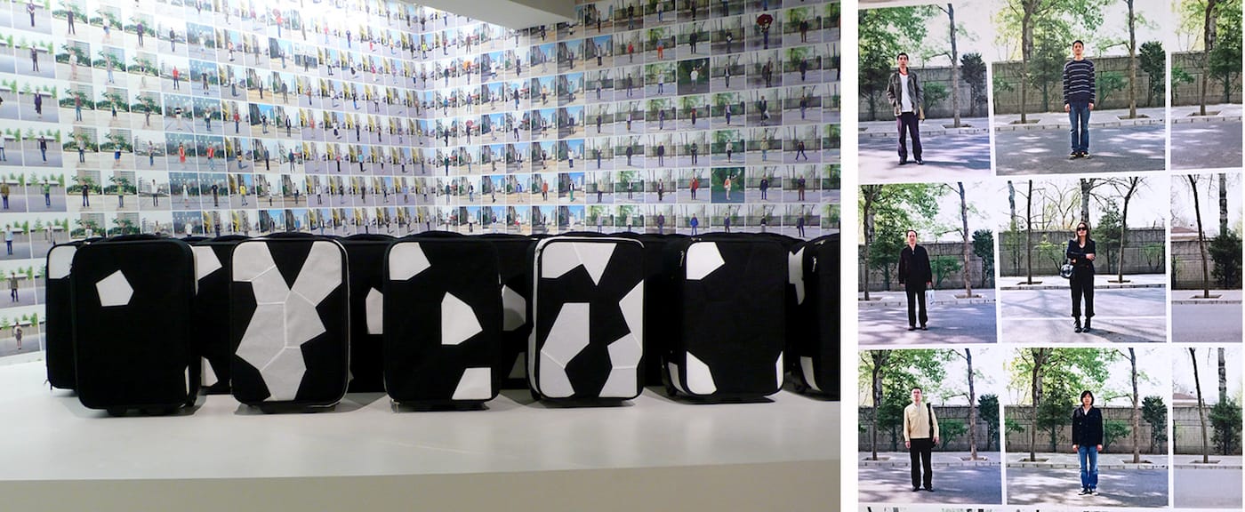 In Art and China after 1989, there is a big stack of thousands of Ai’s transcribed Twitter posts (are you listening, posterity?), photos of big Ai dropping and smashing to bits a Han Dynasty urn (supposedly a Duchamp-inspired gesture), and photos, lining one display area’s walls like wallpaper, of the 1001 “ordinary Chinese citizens” the would-be provocateur paid to send, in a “temporary migration,” to view the Documenta art expo in Germany in 2007, along with the suitcases his studio designed for them. By turning them, literally, into wallpaper, Ai strips the participants in his costly — and maybe a little bit cynical? — caper of their humanity. In such trite spectacles — this one was titled “Fairytale” — the subject is always Ai.