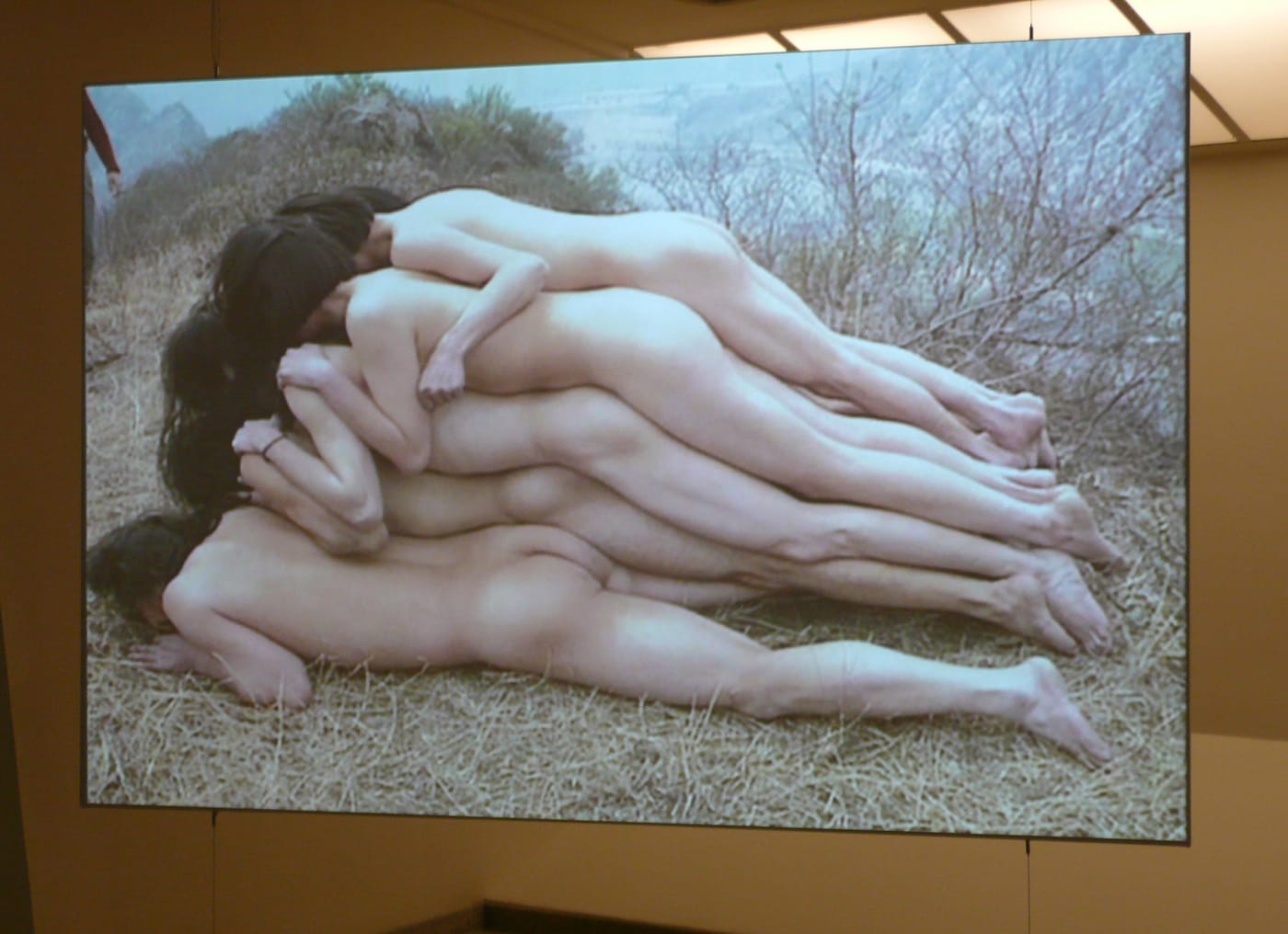 By contrast, some of the most humanistic works here were made with very limited resources. They include “To Add One Meter to an Anonymous Mountain” (1995), an outdoor performance realized and captured on video by a group of artists from what was then known as Beijing’s “East Village” district of young, poor art-makers who used their bodies as their raw material. In “To Add One Meter,” they lie on top of each other’s nude bodies to create a human hill. In “Kan Xuan! Ai!” (1999), a one-minute video, a young, female artist, Kan Xuan, walks through a Beijing subway-station tunnel calling out her name like some kind of human-feral creature as if to declare — and claim — her existence in a city of unknown millions.