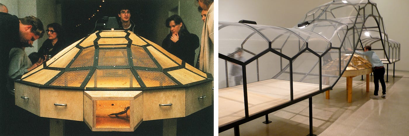 The exhibition takes its title from Huang Yong Ping’s mixed-media “Theater of the World” (1993), a screen-enclosed, tortoise-shaped cage that normally contains crickets, scorpions, cockroaches, lizards, snakes and, other creepy-crawlers that simply devour each other. Due to protests about real or depicted cruelty to animals and what the Guggenheim described as “threats of violence in reaction to the incorporation of live animals” in this work, “Theater of the World” is being shown without them. Similarly, two videos have been withdrawn. One is Xu Bing’s “A Case Study of Transference” (1994), in which two pigs are seen copulating; one is covered with Xu’s made-up Chinese characters, the other with Roman letters, in a symbolic meeting/mating of East and West — get it? — or what a wall label refers to as Xu’s “visceral critique of Chinese artists’ desire for enlightenment for Western cultural transference.”