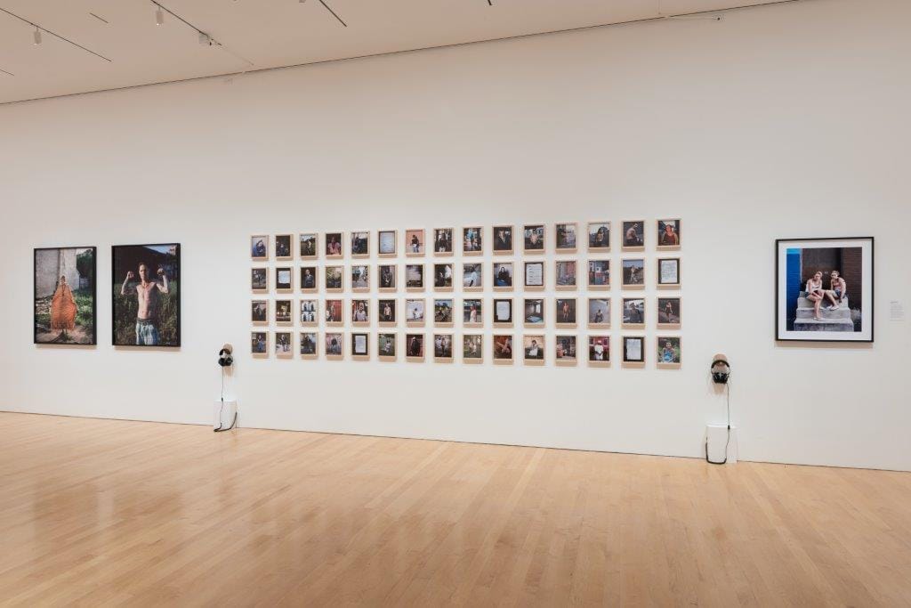 The middle room of the exhibition challenges the visitor to consider the legacy of excessive incarceration rates, as well as notions of home and financial security. A map of Pennsylvania fills one large wall; its only landmarks are prisons, with the number of inmates from Philadelphia and distance in miles to these facilities from the city listed below each prison’s name. An accompanying series of Polaroid portraits of inmates provides information on how long they’ve been imprisoned — an overwhelming number of middle-aged adults in these images have been incarcerated since their late teens. These portraits are part of a project sponsored by Reconstruction Inc.’s Fight for Lifers program, which aims to abolish life sentences without the possibility of parole.