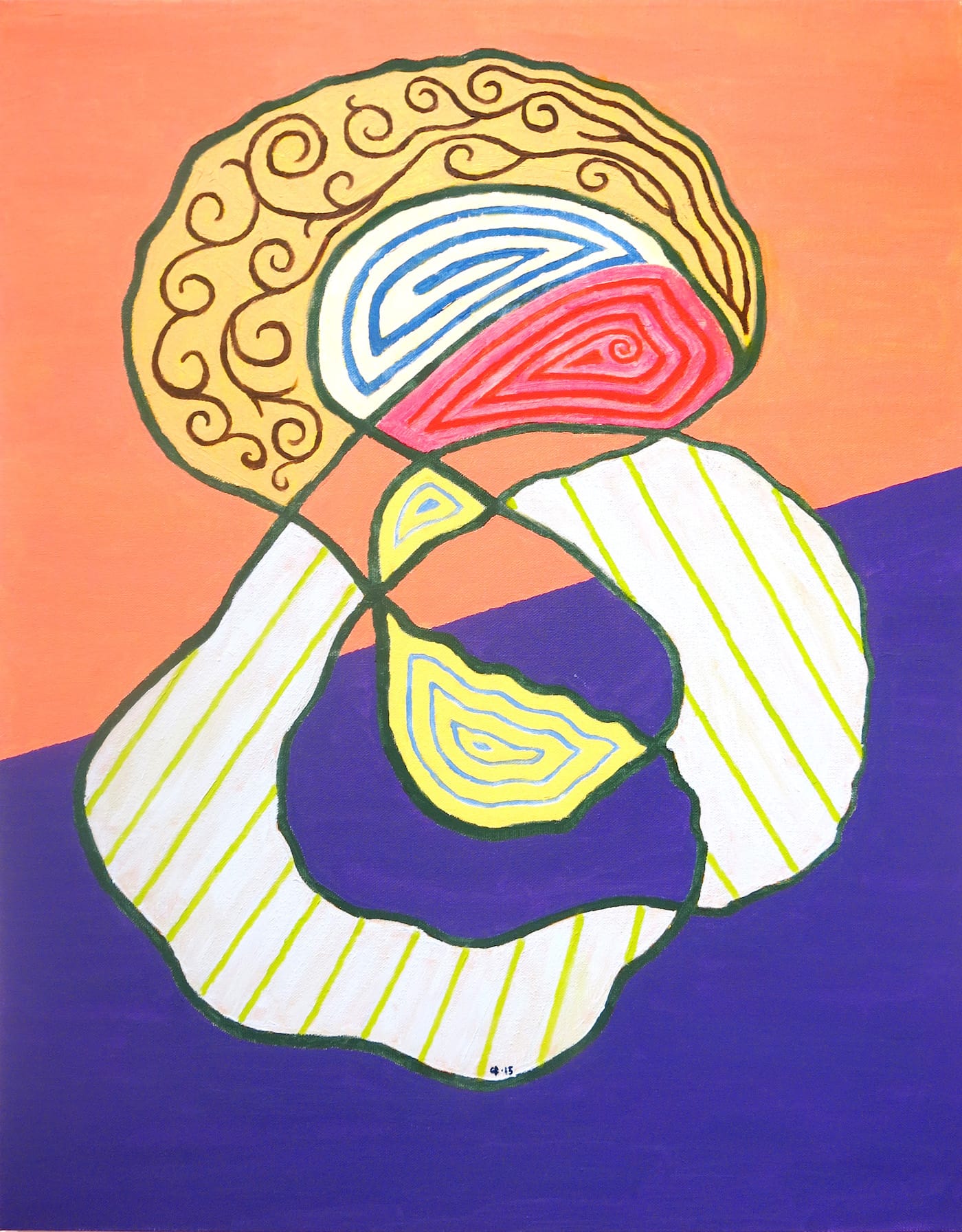 In “Dolly” (2015), the horizon line is diagonal, starting in the lower left quadrant and crossing to the upper right. Each outlined area is marked by a different linear pattern done in a different color. A salmon-colored sky and purple ground peers through the large openings in the multipart form. It does not take much imagination to see how Boyce moved from doodling to making paintings. And yet, despite the simplicity of what he does, each of the paintings has something particular about it.