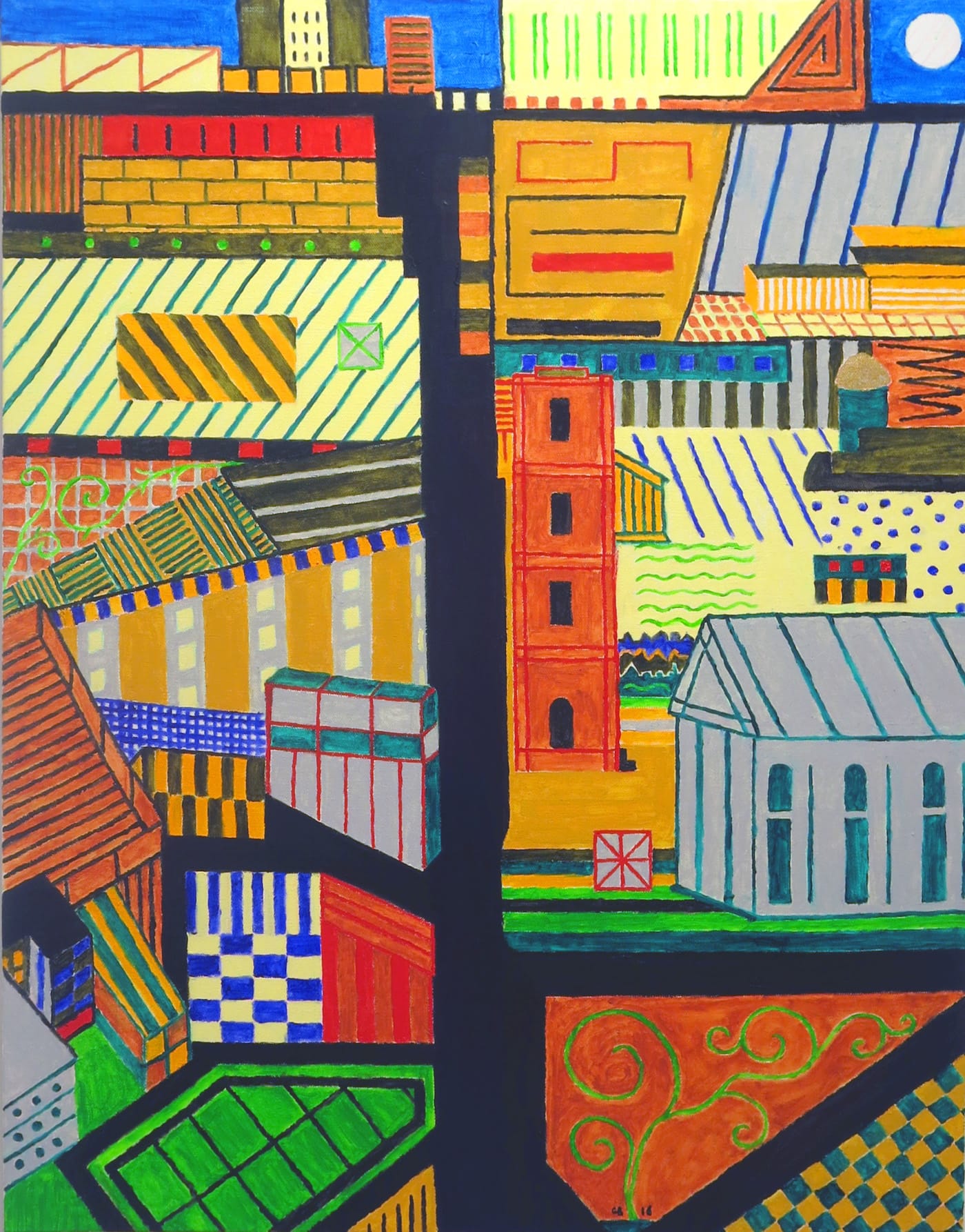 What this show has going for it is that, while he could have, he has not become formulaic. In “Urb” (2016) his most ambitious canvas, Boyce depicts an aerial view of a street, which divides the canvas vertically, with buildings and rooftops on both sides and a skyline visible just below the painting’s top edge. Different perspectives and patterns have been joined together to form a dizzying mishmash that simultaneously evokes walking down a small town street, flying over a city in a helicopter, and looking out from an apartment window. The colors and lines are solid, forming a patchwork of shapes, which run from schematic representation to abstract patterning.
