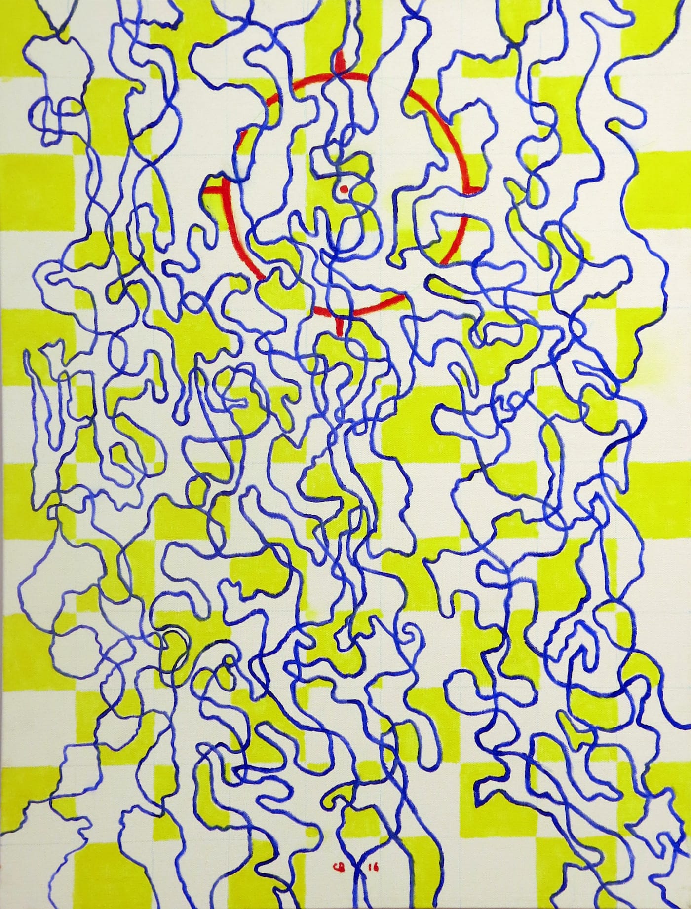 In “Morning Watch” (2016) — the other painting that departs from abstract figures set in a flat abstract landscape — Boyce superimposes restless, meandering blue lines over a yellow and white checkerboard pattern. Squeezed between the blue lines and the yellow and white squares is a partially obscured red circle, presumably the eponymous watch.