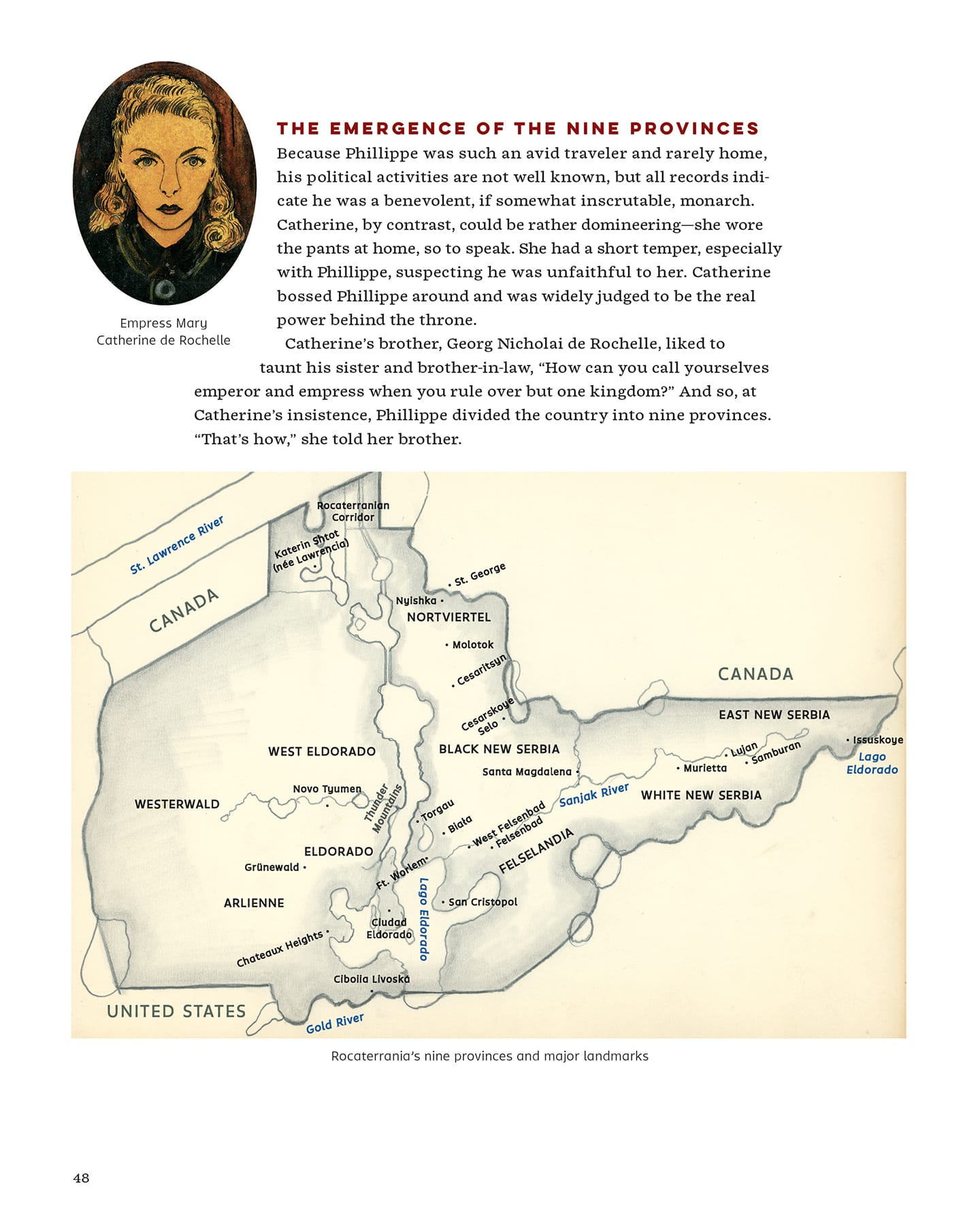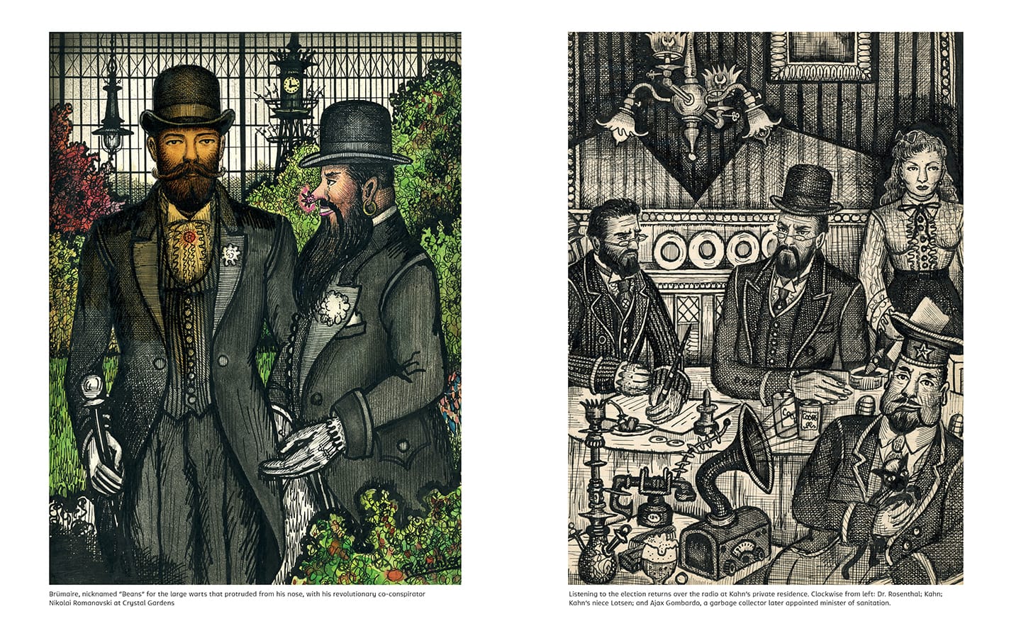 Situated in upstate New York, near the border with Canada, it was a place whose made-up history, social system, and culture were also influenced by Kuhler’s interest in and knowledge of Victorian-era styles in general and his fascination with Germanic and 19th-century Eastern European lands. Over time, he even developed “Rocaterranski,” a unique language for his secret place in the imagination, complete with its own alphabet.