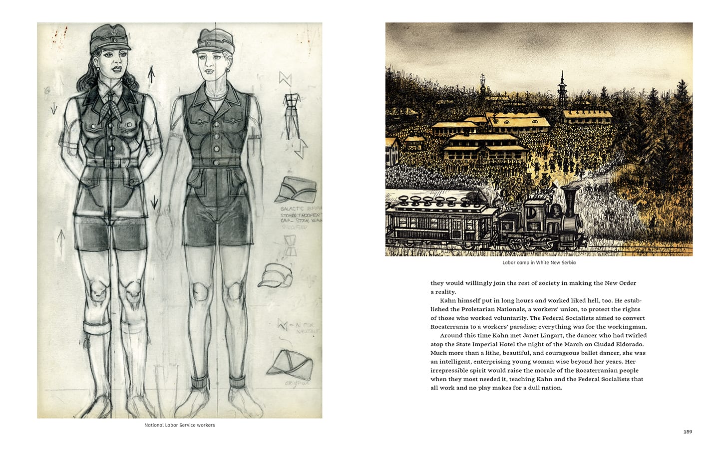 Ingram, channeling Kuhler, also describes Rocaterrania’s social customs and scientific advances (one of its farms was “the first to use human waste as a crop fertilizer”), and summarizes, with some of the most striking of any of Kuhler’s full-color drawings, the story of a Rocaterranian film, supposedly produced in 1956, about the voyage of the nation’s astronauts to the Moon. “[T]he people need an escape once in a while,” a confidante of Rocaterrania’s president tells the little country’s leader in what is, in effect, the proposing of a fantasy within a fantasy. A reader can imagine Kuhler relishing his imagination’s rich turns.