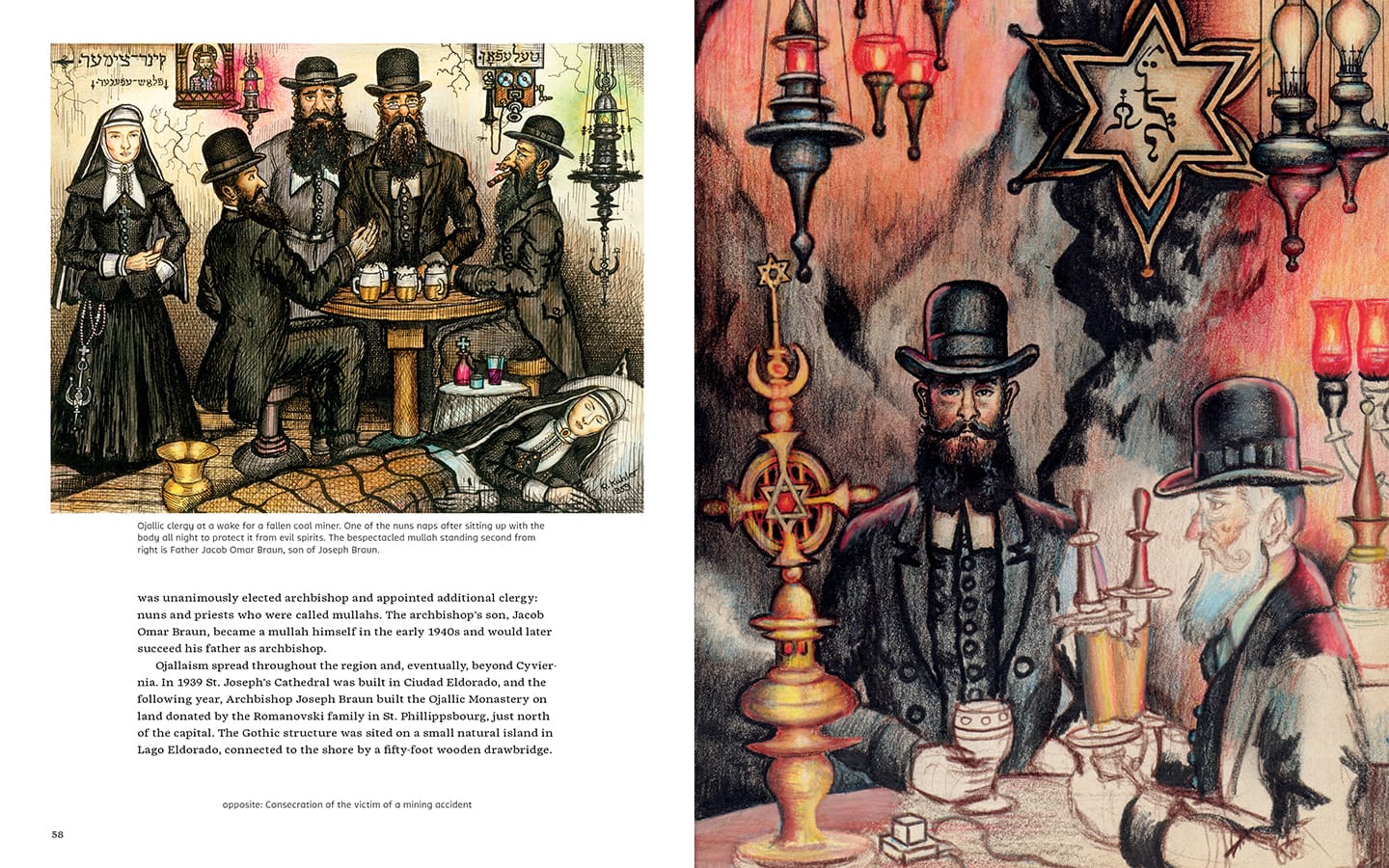 The complexities of Henry Darger’s inventively illustrated, good-versus-evil magnum opus, with its legions of naked, Victorian little girls with penises in combat against monsters, armies, and hangmen, or those found in the work of the Swiss art brut legend Adolf Wölfli (1864-1930), whose alter ego, “Saint Adolf,” creates an entire universe within a 45-volume grand narrative filled with texts, musical scores, and elaborate images, might seem edgier or more sophisticated than the multifaceted but comparatively familiar storybook character of Kuhler’s big production. Still, as Ingram’s book suggests, Kuhler brought something of a polymath’s resources, along with effusive enthusiasm, to his creation of Rocaterrania in all its detail.