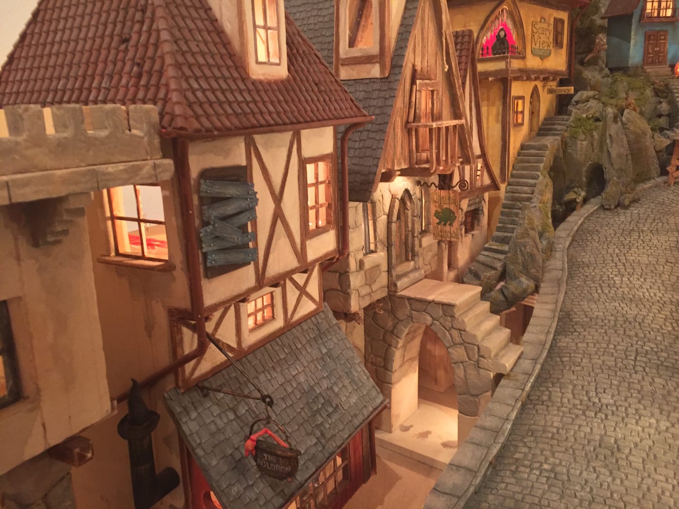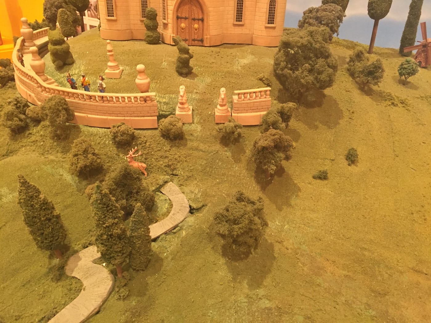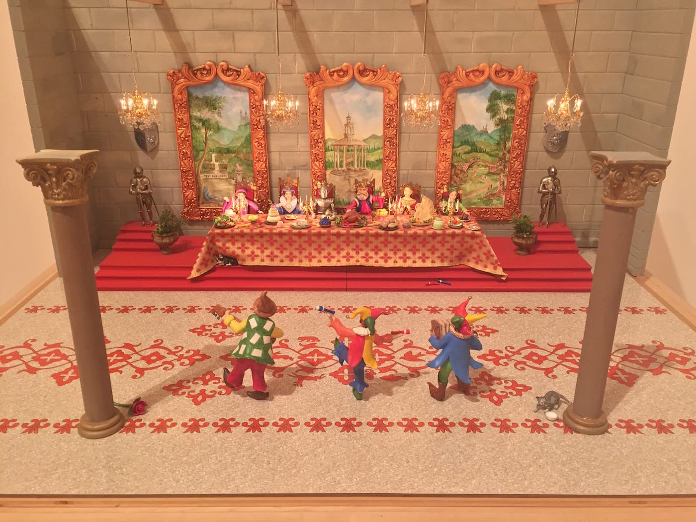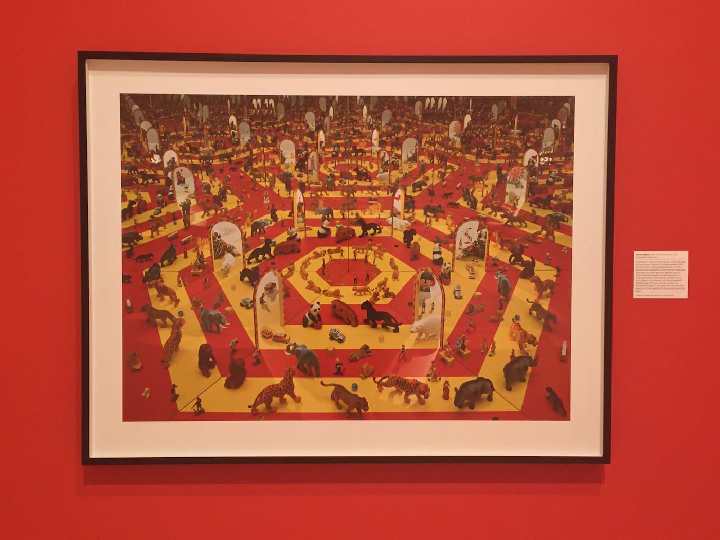 Even when illusions aren’t part of the image, there’s a fun novelty to each photograph. In “Balancing Act,” created for the Kids Gallery of the Connecticut Science Center, Wick balanced 117 objects on a Lego block without any adhesive (stepping on a Lego is excruciating, so I’ve never doubted their strength). And the models used for his Can You See What I See? books are the exhibition’s most delightful components, with detailed dioramas of fairy-tale castles, haunted houses, and beach shacks presented alongside their accompanying photographs. Wick photographed and zoomed in on these models until everything tiny became massive, a child’s eye-view of a microcosmic world. In “Entertaining the Guest,” from Can You See What I See? Out of This World, jesters juggle and dance for seated royals. The accompanying model allows viewers to see details omitted from the photo; there’s even a button to switch on the dining hall lights.