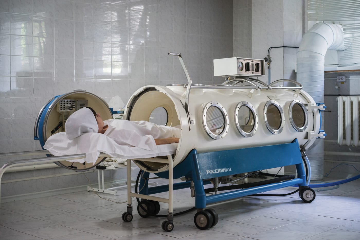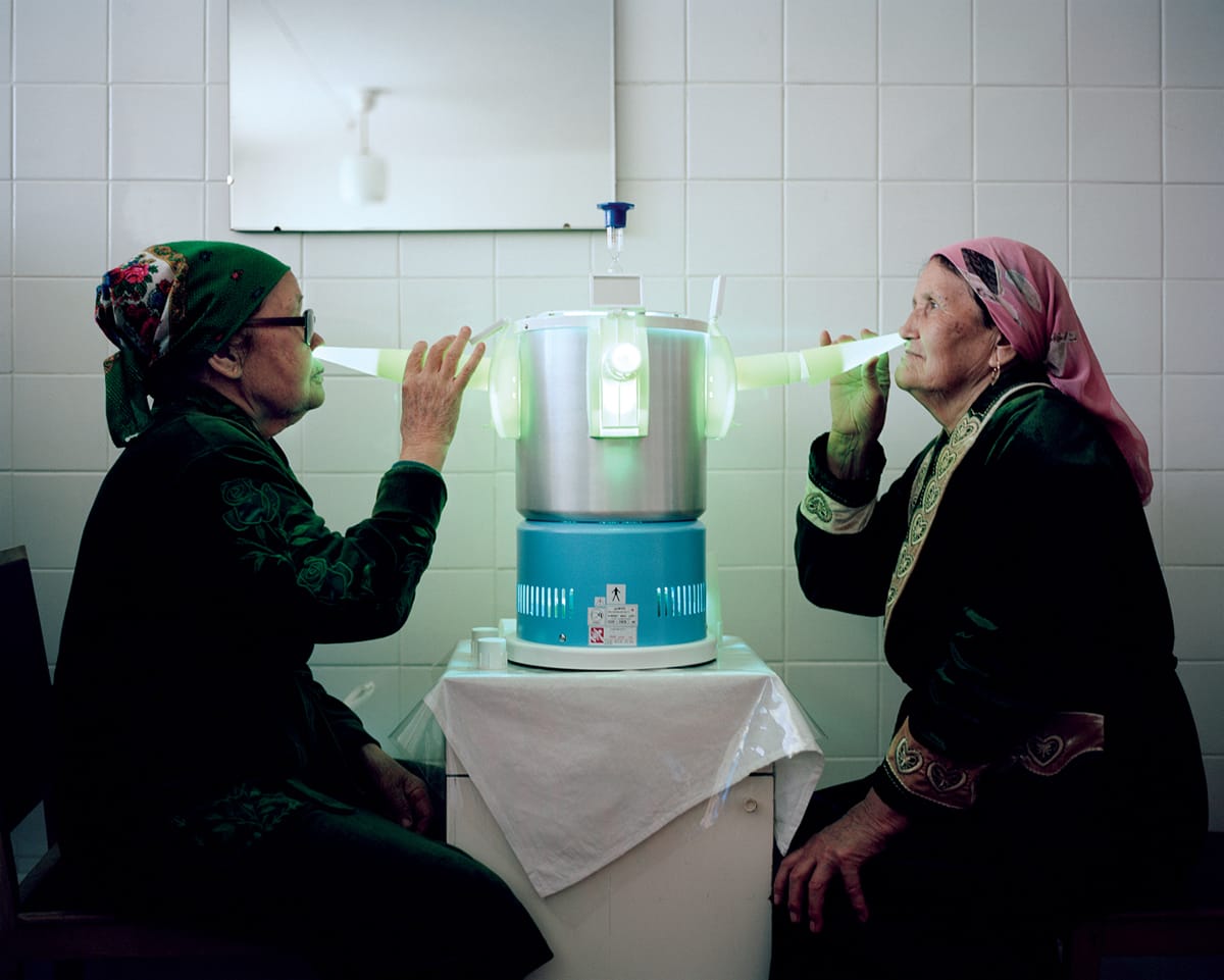 Shot documentary-style, the photographs in Holidays in Soviet Sanatoriums offer glimpses of the many contraptions used in these treatments, portraits of visitors and workers, and views of the buildings from a distance. The architecture of these institutions are just as intriguing as the activities that unfold within them; they represent unique examples of brutalist, neo-futurist, and even neoclassical styles, although many of these giants are now dilapidated.