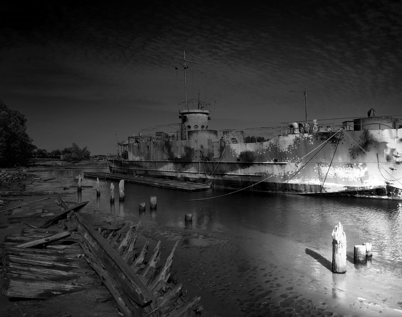 Thomas Bangsted: Yeah. But for these maritime works, for the most part, I have started with locating a Navy ship that is still kind of authentic to how it appeared during the World Wars. There’s not many left to choose from, and I would travel and photograph them, and then I later recreated the specific camouflage it had — or I invented my own. And then I would have to recreate the landscape or setting for it, because it will usually be in a contemporary environment.
