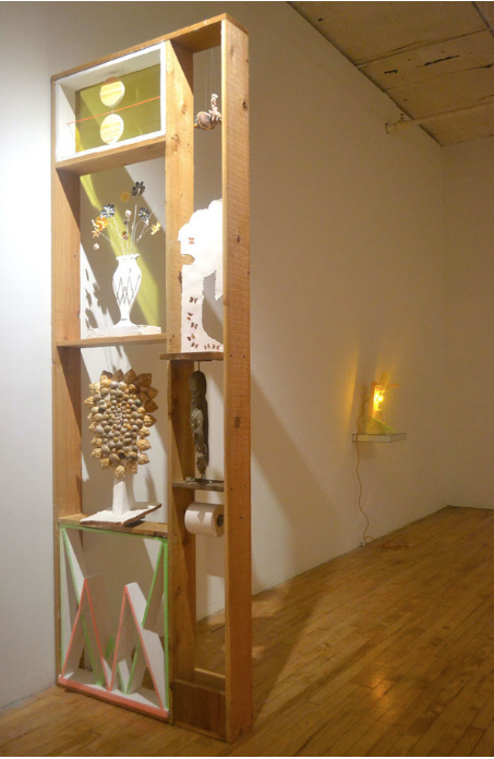 Ultimately, I’d like to think the installation is about Wetzel’s memory of his childhood home, littered as it is with fragmented references to his childhood. I’d also like to think the drama of the shadows is intentional and necessary, referencing memory and the past. But here too I am thwarted because there is a whole other aspect to the show — that of a kind of Surrealist-inspired arrangement of sculptural objects resembling the bits inside of Joseph Cornell’s boxes. Wetzel has put lots of unrelated materials into a conversation that are maybe so personal they don’t make rational sense to anyone but the artist.