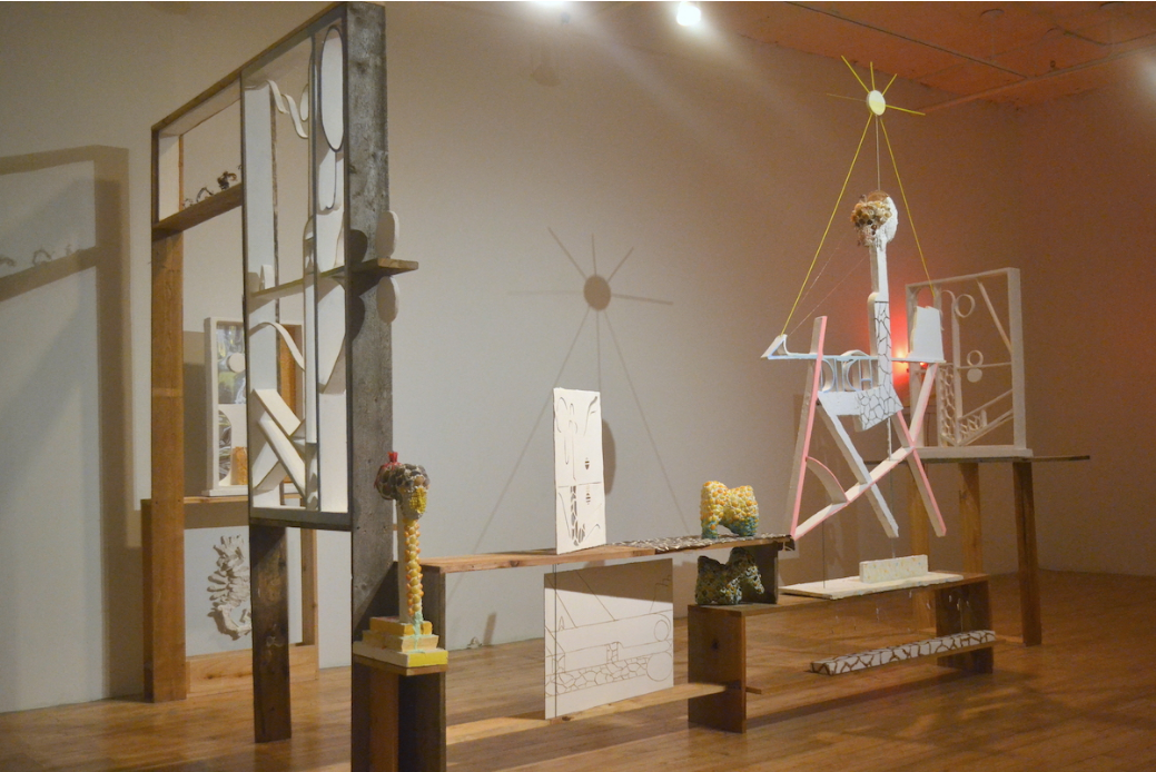 That said, there is one large, central sculpture obviously made with care and consideration; it resembles a sitting figure with the word “DITCH” on it. The implied head is a generous glob of plaster oozing off the top of a plank with clam shells pressed into it. The figure is crowned with a spindly sun shape casting its own complicated shadow behind itself that’s as interesting as the sculpture.