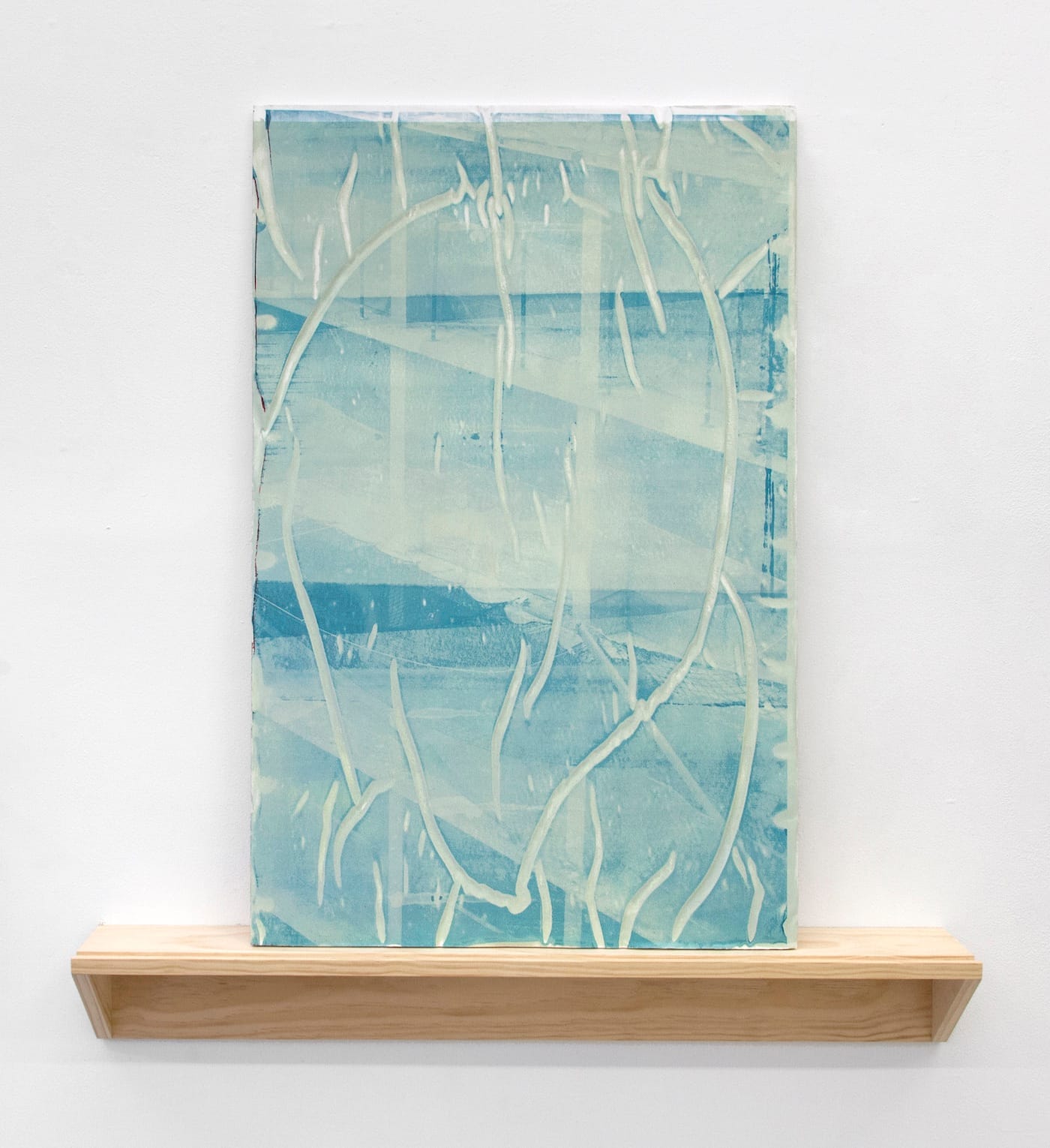The screenprinted image is nearly illegible in “Break It Down (fault lines)” (paper, silkscreen and plaster, 40 by 26 inches, 2016); not only is it extremely faint, but the slab of plaster it’s printed on is riddled with long, finger-thick grooves from some anomaly of the casting process. I’m making it sound like a mess, but it’s the strongest piece in this very strong show, because the visuality of its abstruseness grabs you and holds you. Unlike some other conceptually oriented work, it doesn’t resist being deciphered, doesn’t whisper, “just you try to figure me out.” It’s so materially strange — equally sumptuous and naked, somehow — that it draws you in and goes to work on you.
