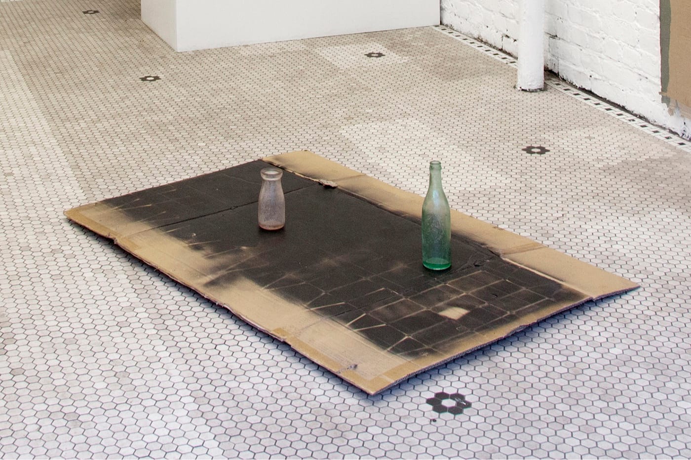Salvaged from the island, two thick, fogged-looking glass bottles — apparently decades old, maybe the remnants of a dockside lunch break back in the day — are recycled for “Curbside (Black Sky)” (painted cardboard, glass, 32 by 47 inches, 2017), where they are positioned on a sheet of cardboard laid out in the middle of the gallery’s floor. Stenciled on the cardboard in sooty spray paint is the long, narrow grid of a cheap twin-bed mattress spring. You could get knots in your back just by looking at it. “Curbside (corrugated rug)” starts to look comfortable in comparison.