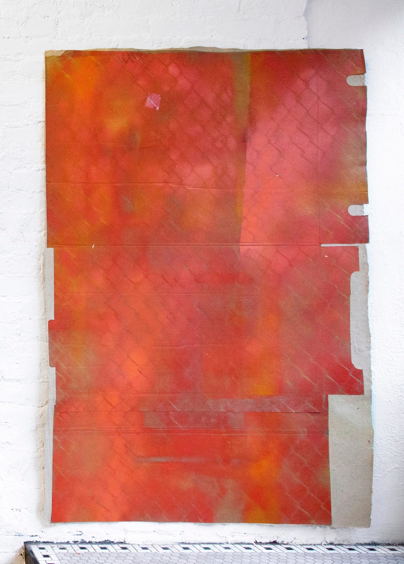 The first works the visitor sees upon entering the gallery are three from Sigal’s “Curbside” series (all laminated painted cardboard, handmade cardboard paper, 60 by 40 inches, 2016). Like tinted fog, a drifting field of moderately saturated vermilion all but fills “Curbside (orange salvage);” just a few oddly shaped bits at the edges of the sheet impinge on this weird expanse, which is fenced off behind a spray-painted stencil of chain link that looks nearly photographic.