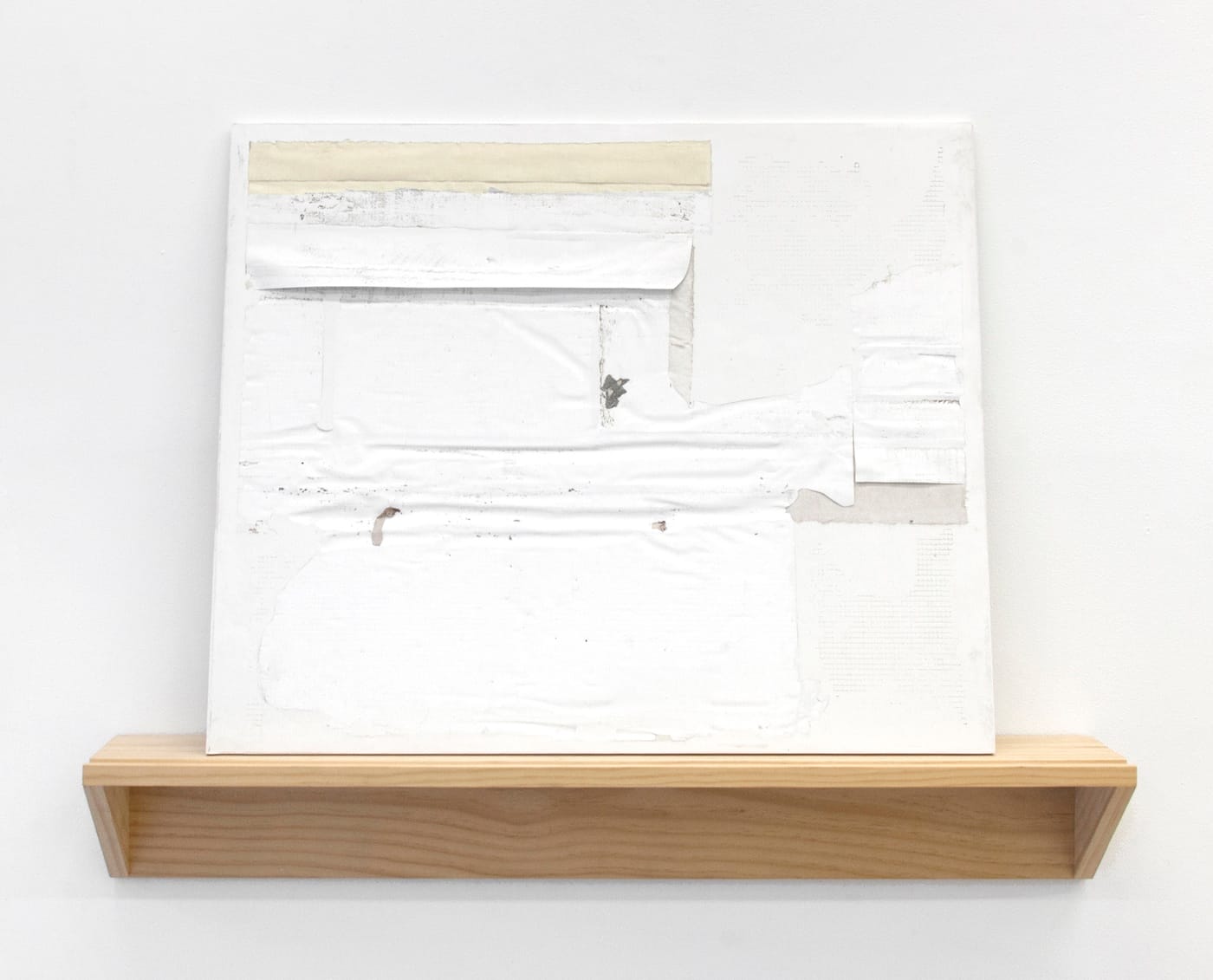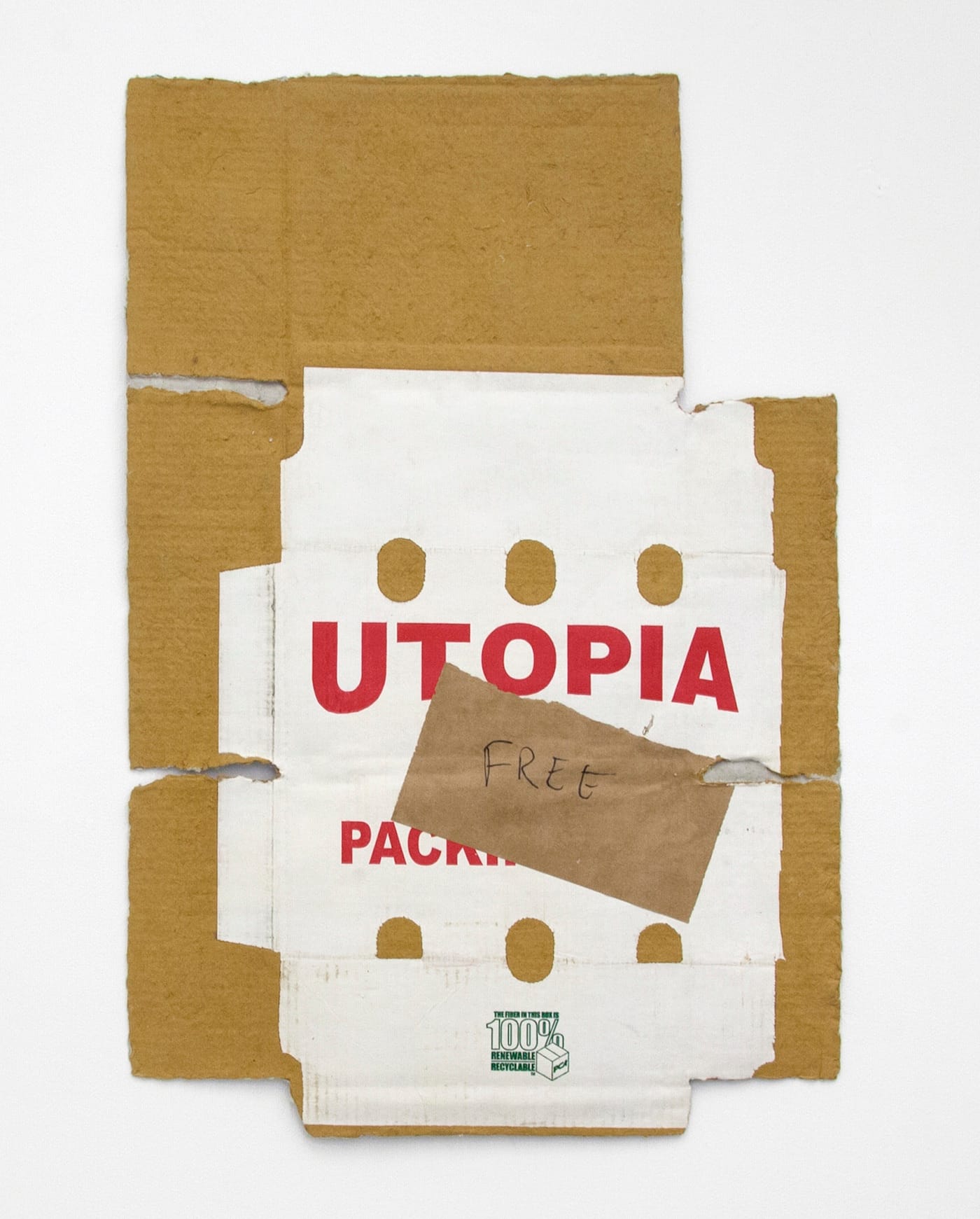 “Mat (Utopia Free)” (cast cardboard pulp with collage, 32 by 22 inches, 2016) is the likeness of a small, flattened carton produced by a certain “UTOPIA” packaging manufacturer, with a hand-lettered “FREE” taped on. It’s modeled after (and/or partly salvaged from) an actual box that had been repurposed for front-stoop giveaways, but it’s unclear just how much of the piece is taken directly from that original object, how much is reconstituted from pulping it, and how much is altogether new.